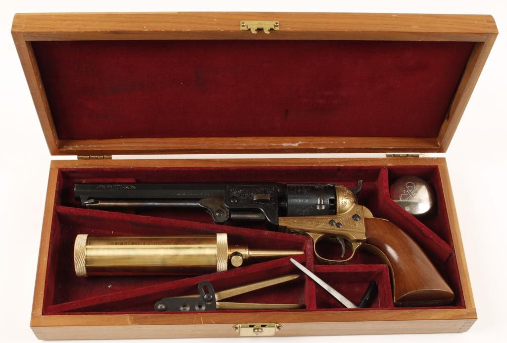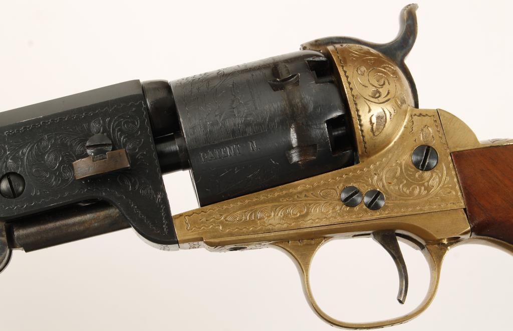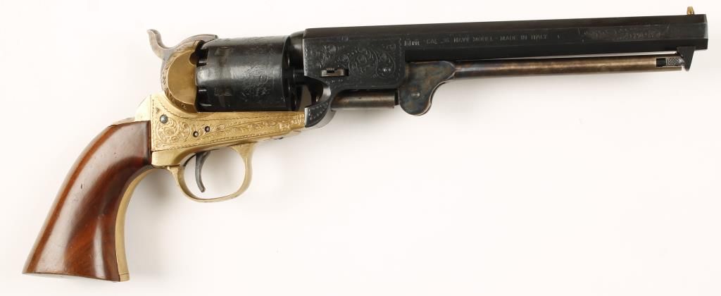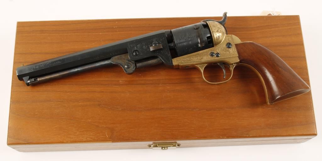 Cased engraved replica black powder single action 6-shot percussion pistol. Blued 7-1/2" octagon barrel. Case colored loading lever, hammer and trigger. Blued and roll-stamped cylinder showing a naval engagement. Brass frame, trigger guard and backstrap. Not cut for a shoulder stock. Lined hardwood case with loading and maintenance tools. Condition is like new in box. *Antique Firearm*