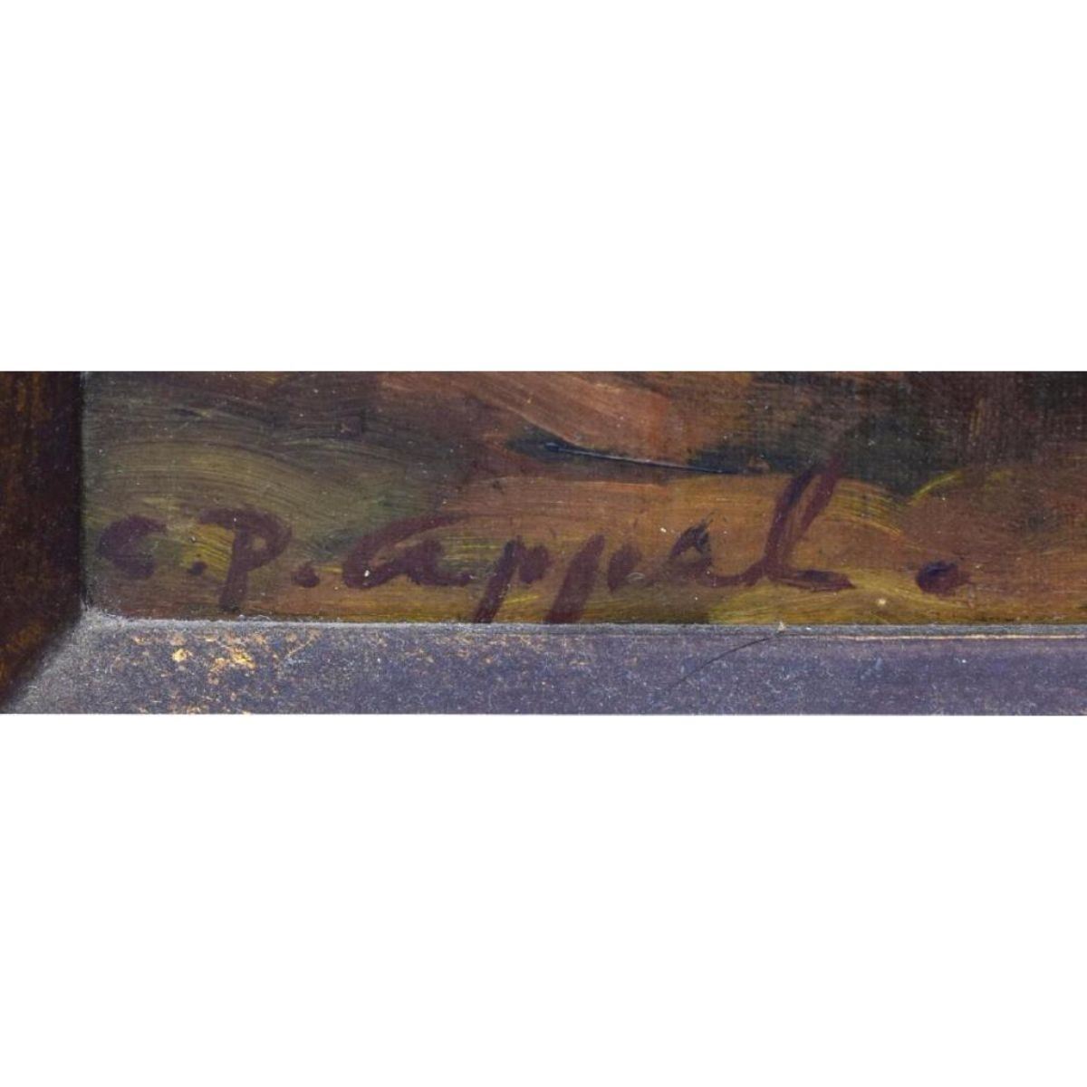 "Glorious Sunrise", oil on canvas landscape, signed lower left C.P. Appel ( Charles P. Appel, New York, 1857-1928), relined, in original period frame. * some molding loss as seen in photos. 23 1/2" H X 19 1/4" W. Overall: 32 1/4" H X 29" W. 13 lbs.