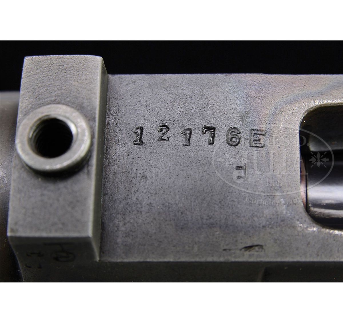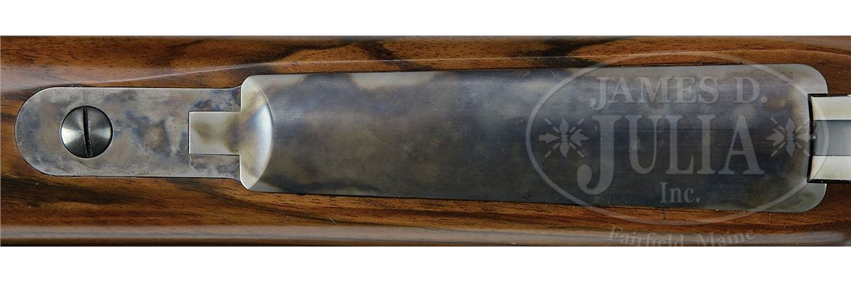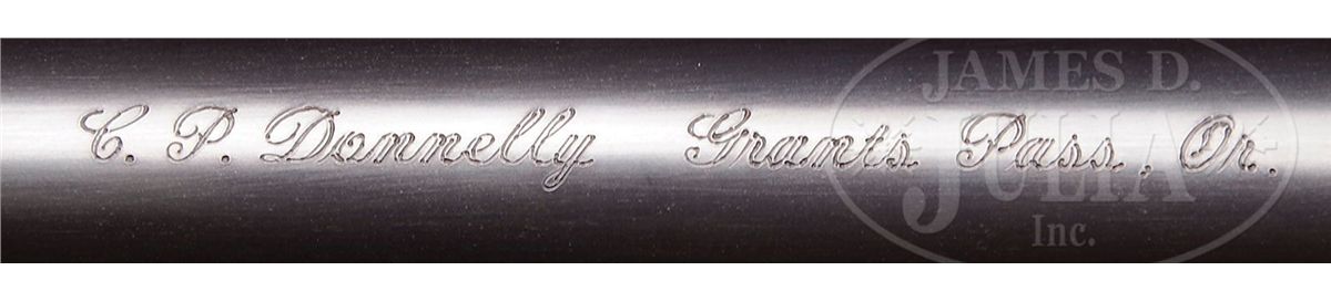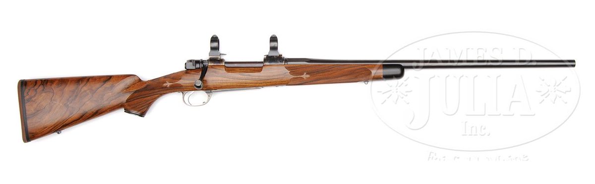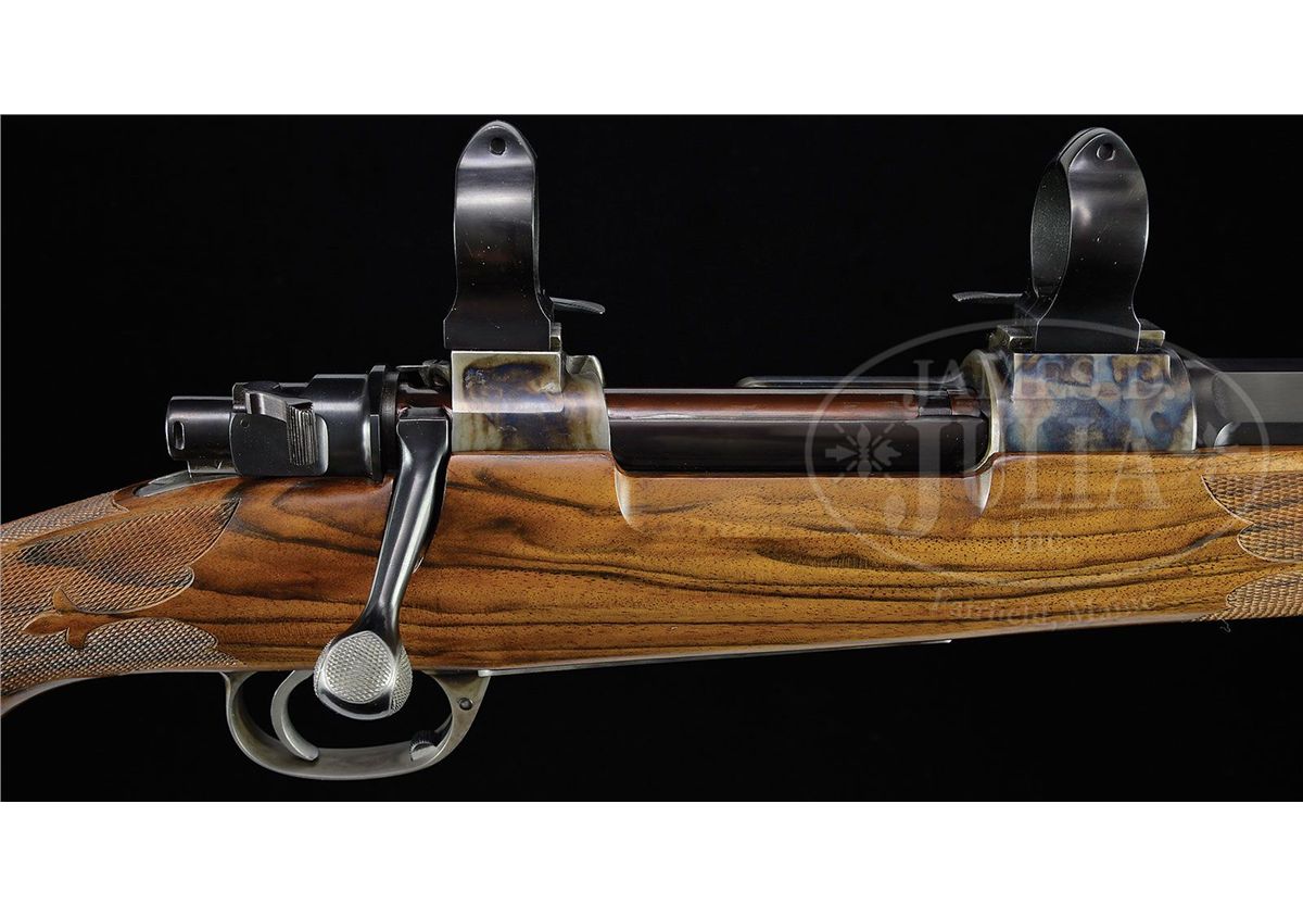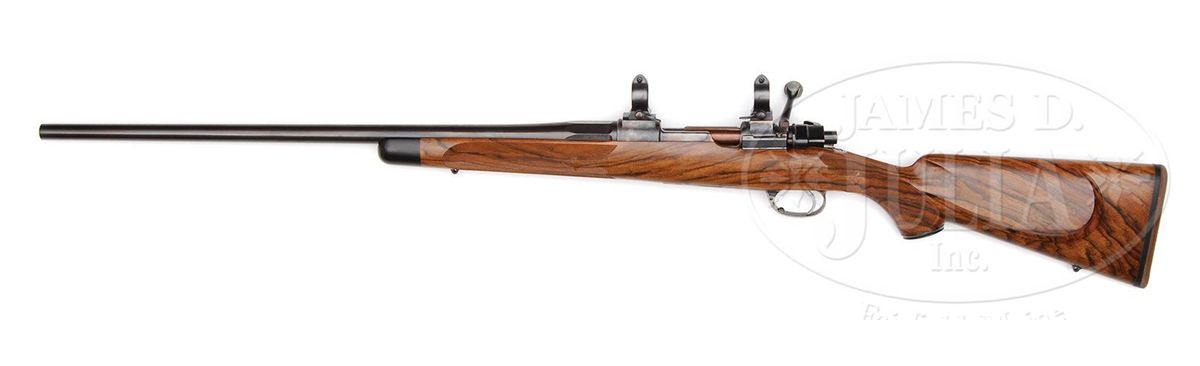 SN 12176E (stamped on bottom of action - out of stock). Cal. 35 Whelen. 24" Medium weight, tapered, round bbl with octagonal section at breech, marked on top "C. P. Donnelly Grants Pass, OR." (well known builder of fine target bbls), is engraved with caliber at left rear. Case hardened Mauser 98 action has been extensively reworked with addition of square bridge and second square addition to receiver ring, both dovetailed to accept Talley type QD rings (included). A Model 70 type trigger has been installed. Blued bolt has four panel checkered knob, handle swept back in FN style. An FN type bolt shroud has Model 70 type safety added. Custom Blackburn type bottom metal with hinged floorplate, has release at front of nicely shaped trigger guard bow. Beautifully marbled and lightly figured European walnut stock is crisply sculpted with swept shadow line right hand cheekpiece, and nicely shaped cut-out at magazine port in classic style. Stock also features sling eyes, skeleton steel grip cap, ebony forend tip, exceptionally well executed fleur-di-lis checkering, and a thin red Decelerator pad. Drop at heel: Approx 2-3/4". Drop at comb: Approx 2-1/4". Weight with rings: 8 lbs. 5 oz. LOP: 13-3/4". CONDITION: Excellent, essentially as new. 4-48101 MGM116