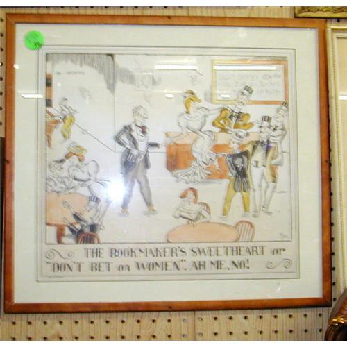 Unique cartoon print The Bookmaker's Sweetheart, by C.P. Meier, 1931. Actual print is H13"xW15" in wood frame which has a hole in each side, otherwise in good condition. Green tag was not taken off. Priint is darker then shown and light reflection from lights. Buyer pays shipping and handling costs.