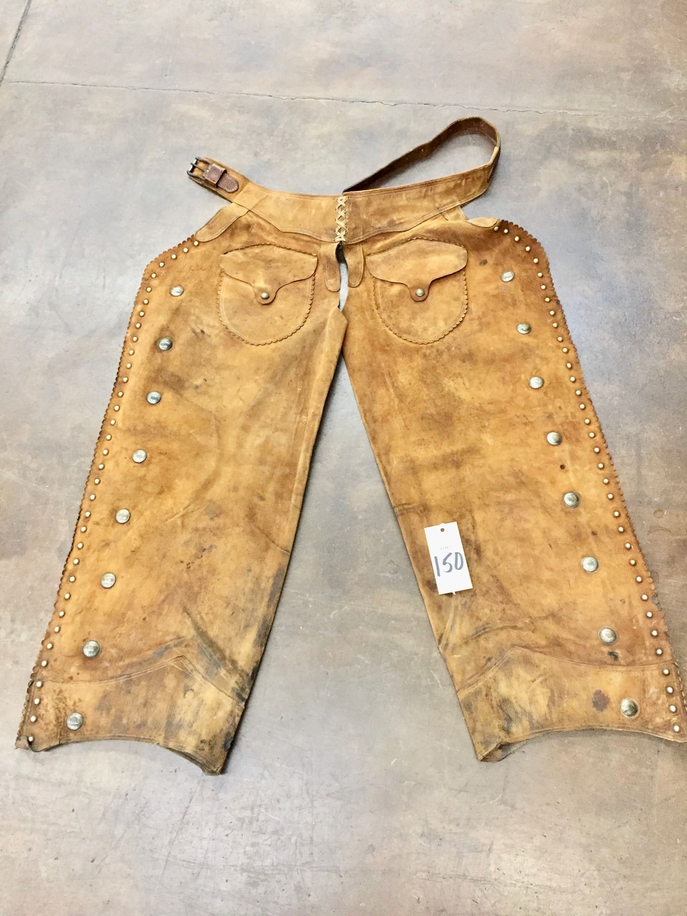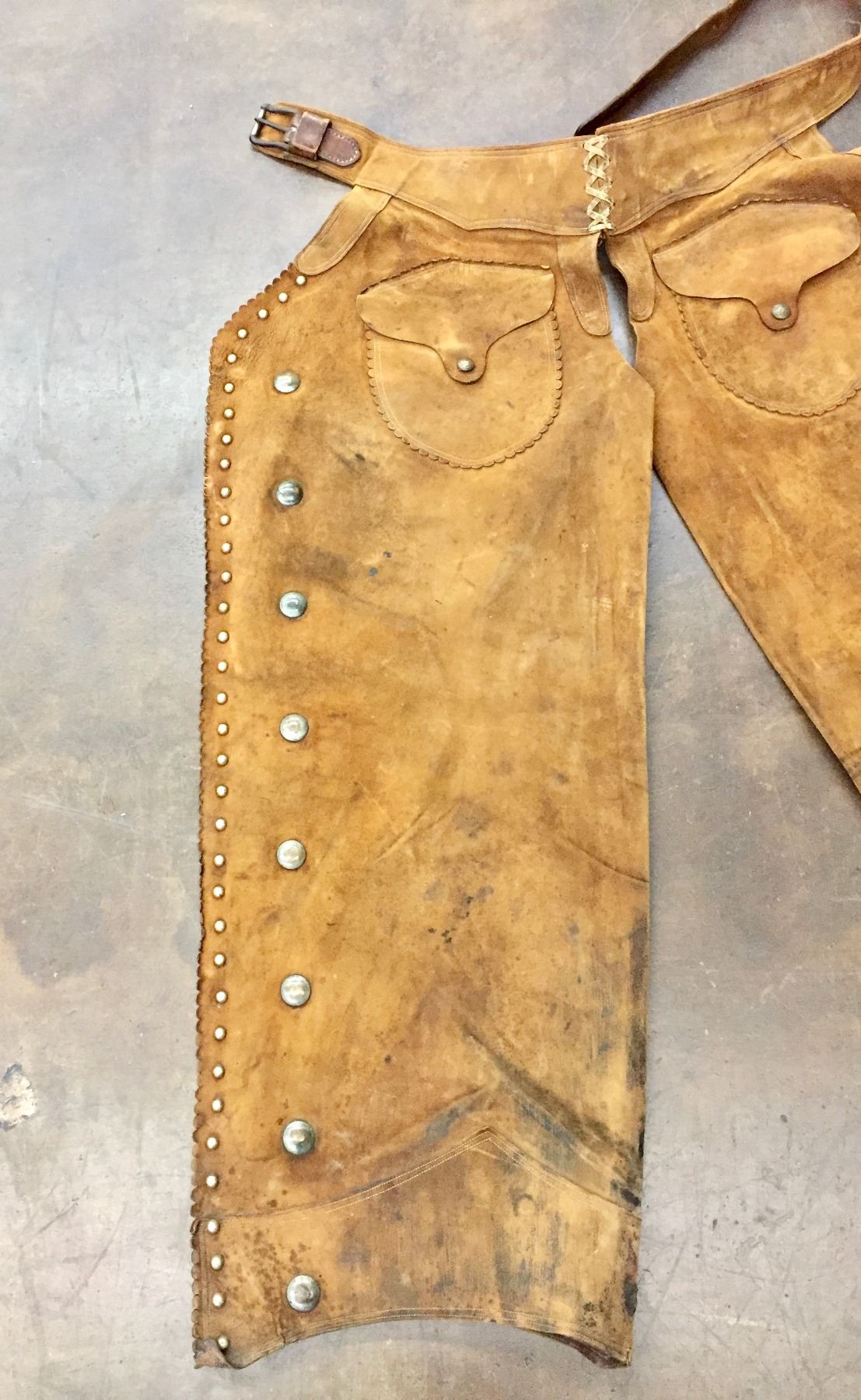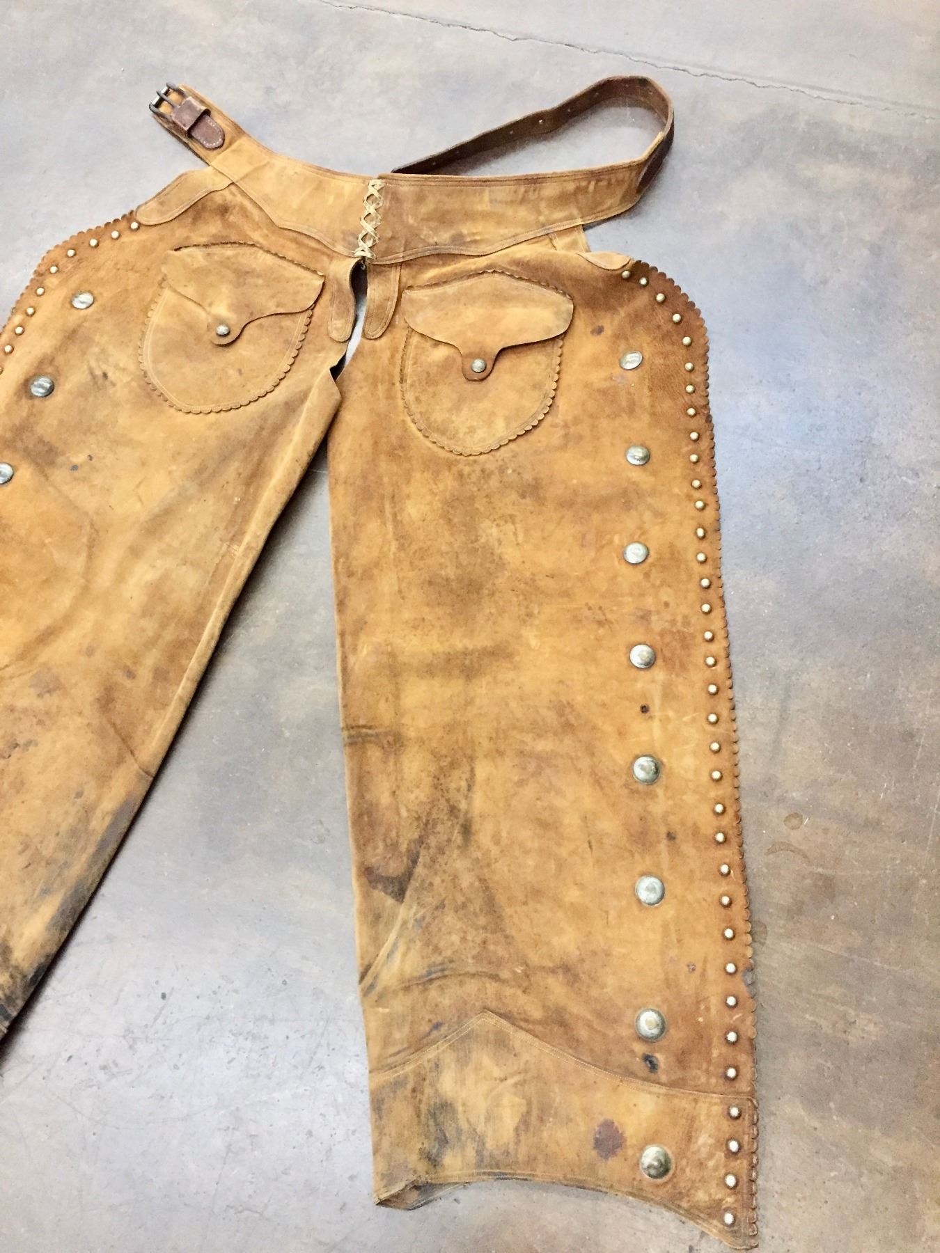 Description: Offered for your bidding pleasure are these C.P. Shipley Chaps. They feature brown leather with brass accents and scalloped edges. Maker: C.P. Shipley. Approx. Age: Vintage. Size: 26-1/2”w x 40” long. Condition: Good for its age, normal wear expected. Please look closely at the pictures - they are an important part of our description. Shipping: There will be a $8 handling / packaging fee for shipping this lot. The actual cost of postage will be added on top of that.