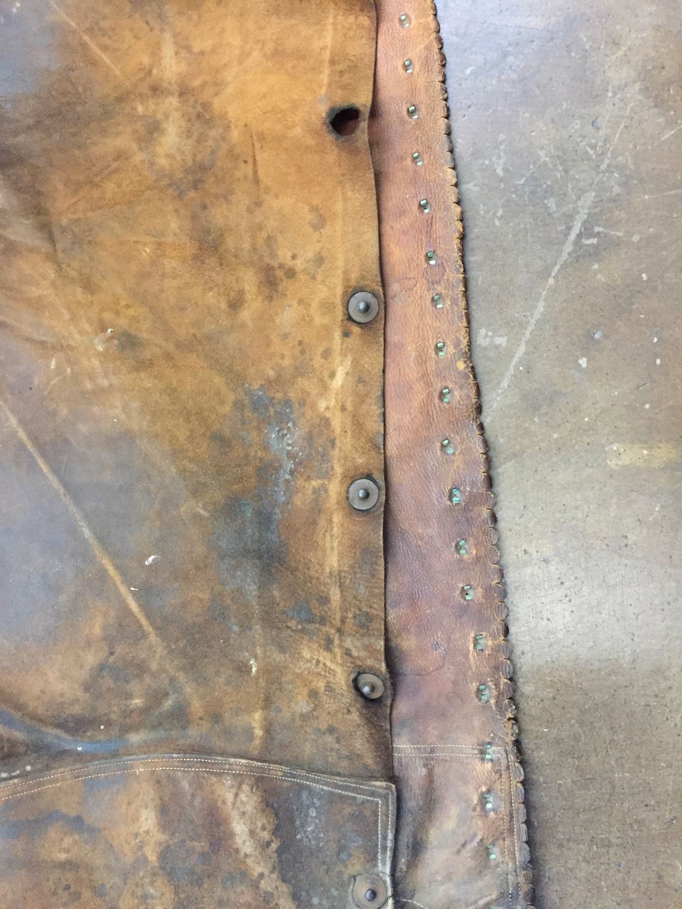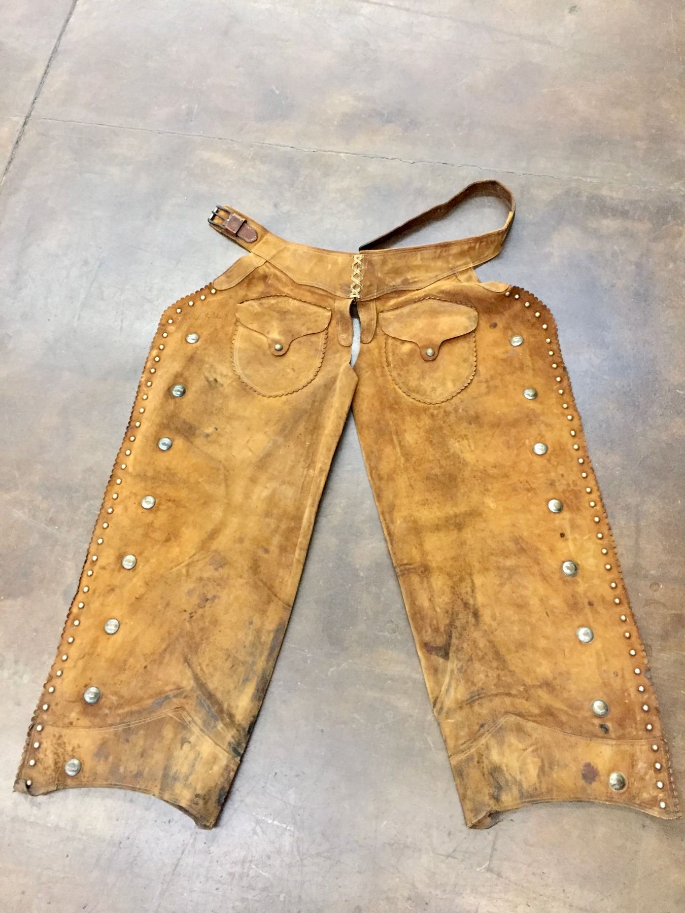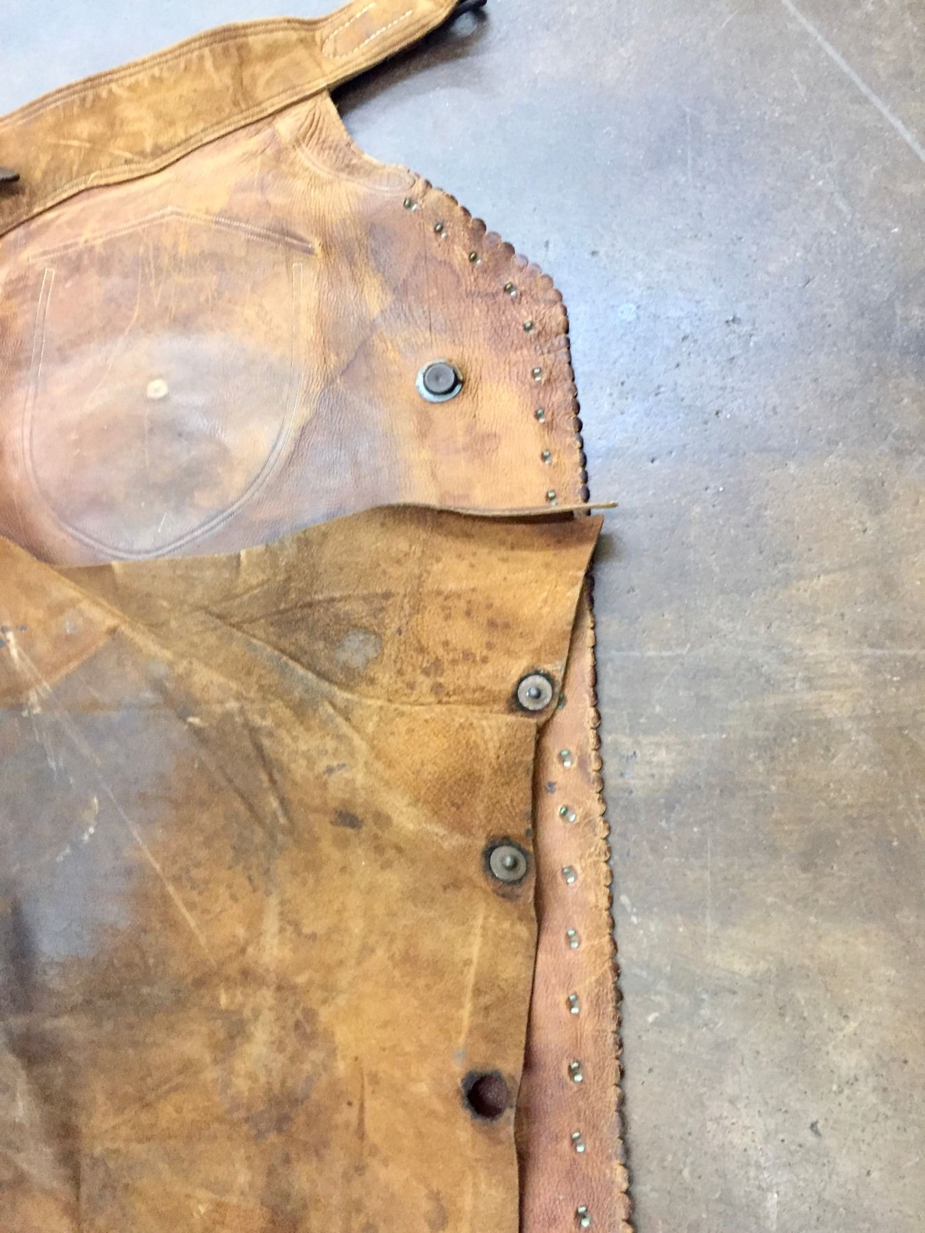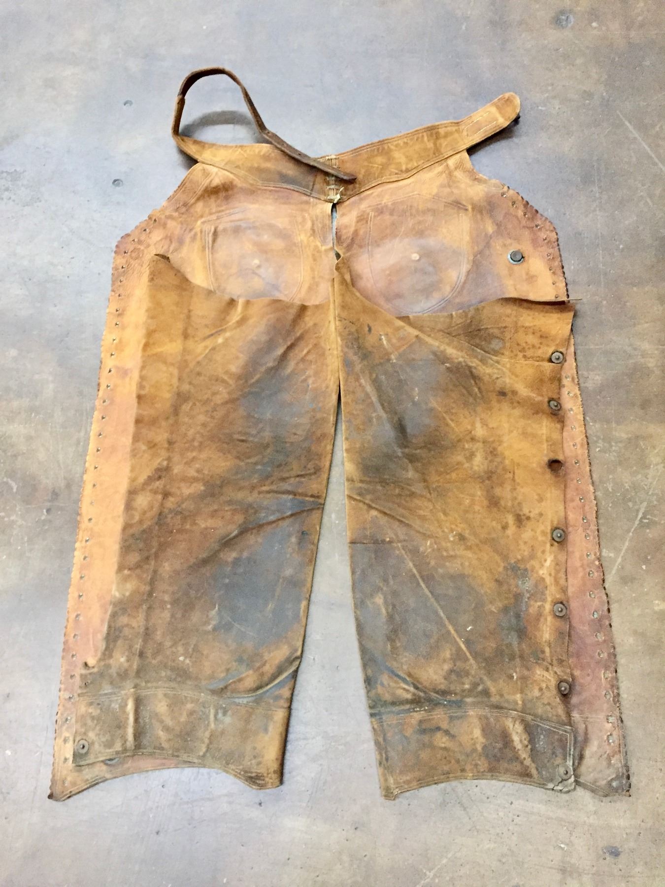 Description: Offered for your bidding pleasure are these C.P. Shipley Chaps. They feature brown leather with brass accents and scalloped edges. Maker: C.P. Shipley. Approx. Age: Vintage. Size: 26-1/2”w x 40” long. Condition: Good for its age, normal wear expected. Please look closely at the pictures - they are an important part of our description. Shipping: There will be a $8 handling / packaging fee for shipping this lot. The actual cost of postage will be added on top of that.