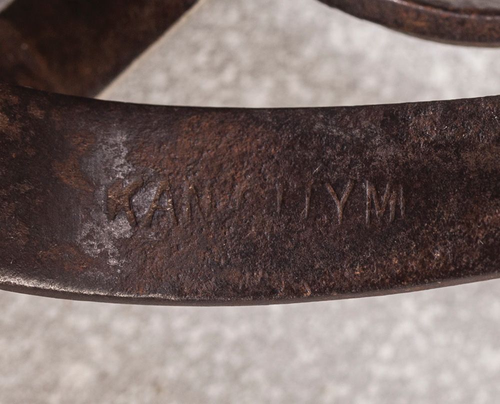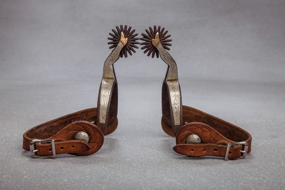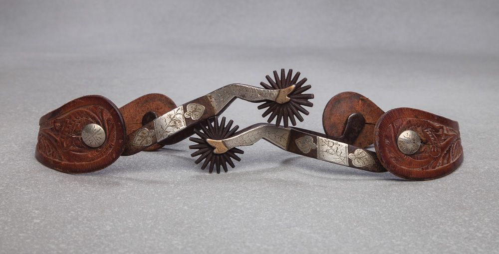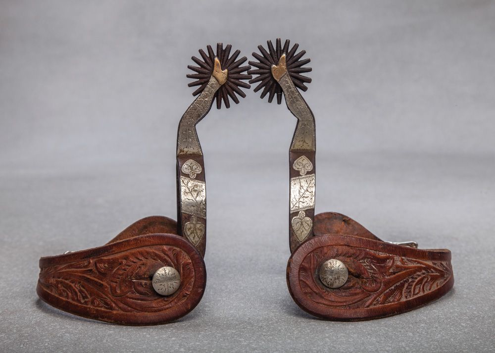 C. P. Shipley Gal Leg Spurs. Very nice pair of double-mounted C.P. Shipley / Kan City / Mo maker-marked, catalog pattern No. 8, gal leg overlaid spurs with 20-point spoke rowels, two-piece floral carved leathers and original mountings.