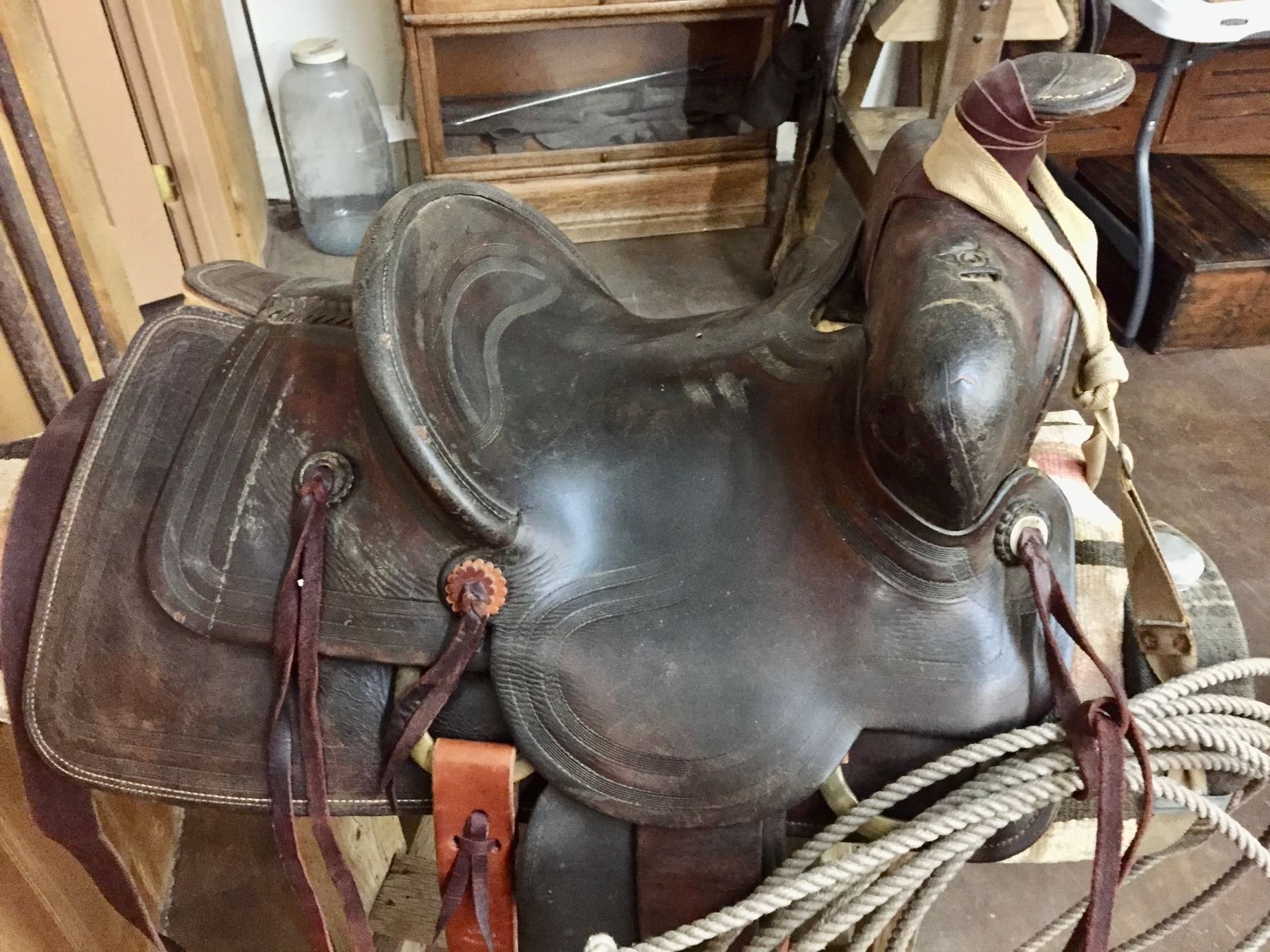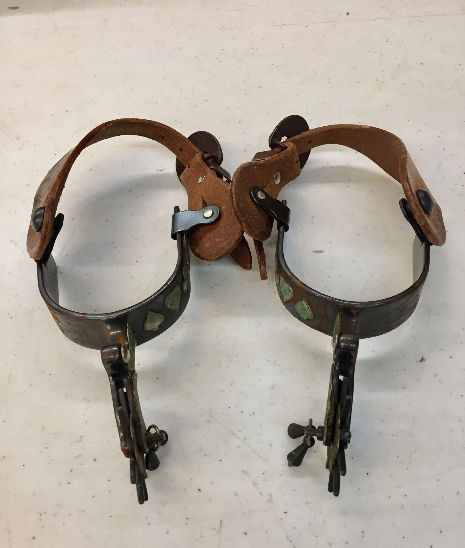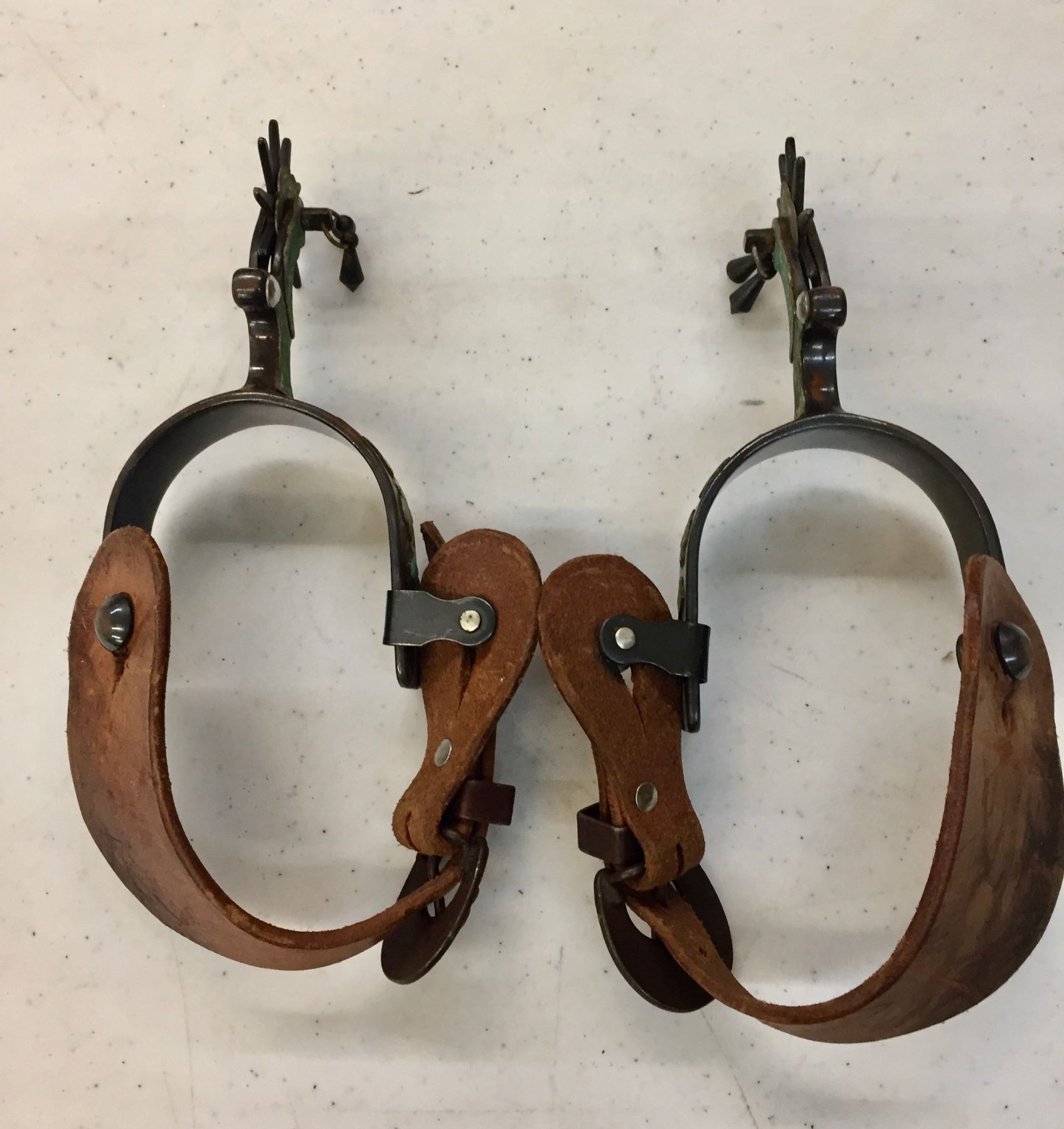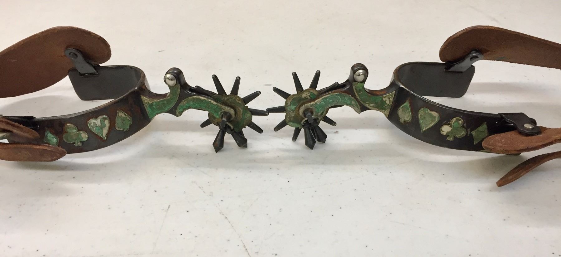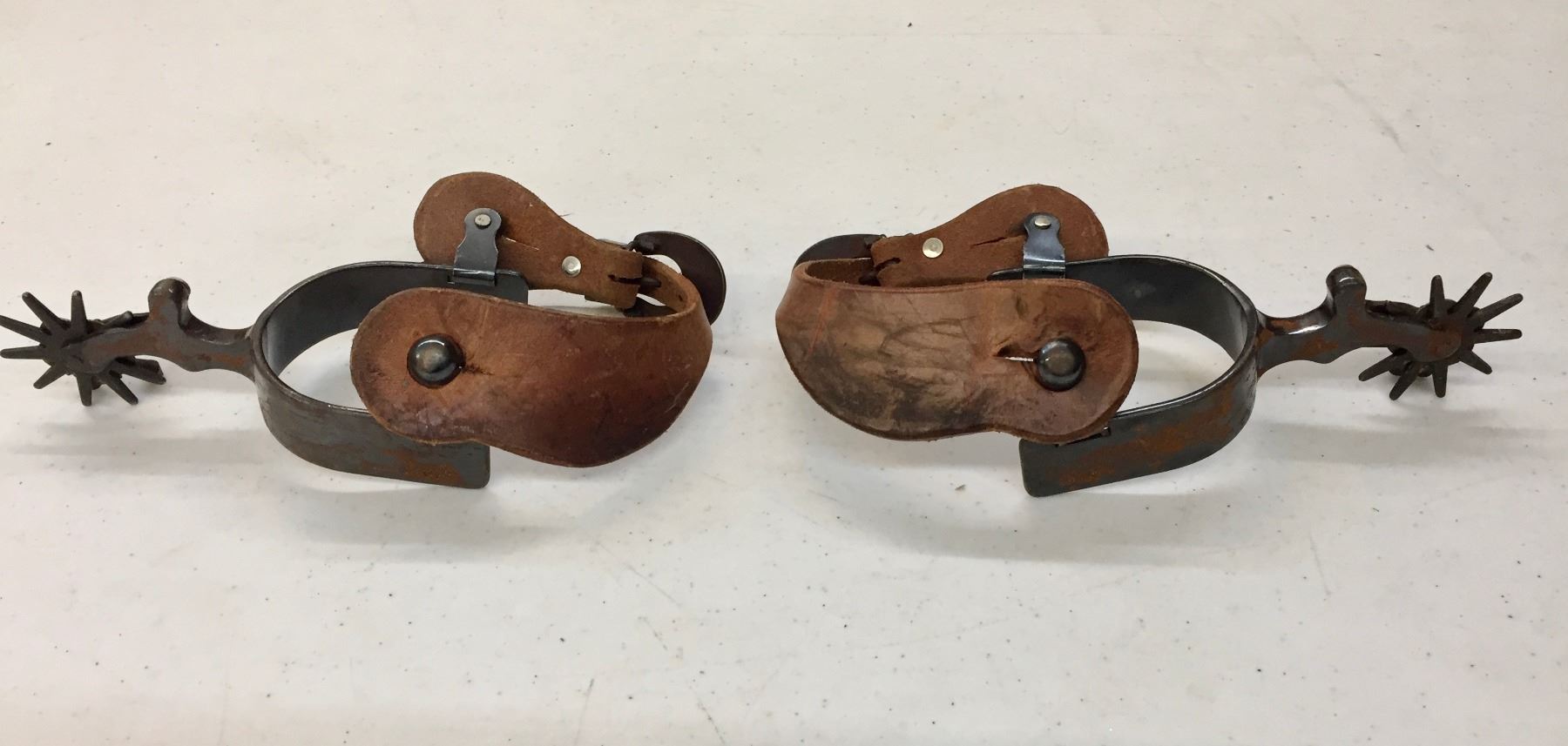 Description: Featured for sale in this lot is a C.P. Shipley Saddle with decorations and two pairs of spurs. You get all of the items in this display! Maker: C.P. Shipley on the saddle. Approx. Age: Vintage. Size: 11-1/2” seat. Spurs 3” heel and 3”1/2” shank, Spurs 3-1/2” heel and 4” shank. Condition: Good for their age, normal wear expected. Please look closely at the pictures - they are an important part of our description. Shipping: There will be a $15 handling / packaging fee for shipping this lot. The actual cost of postage will be added on top of that.