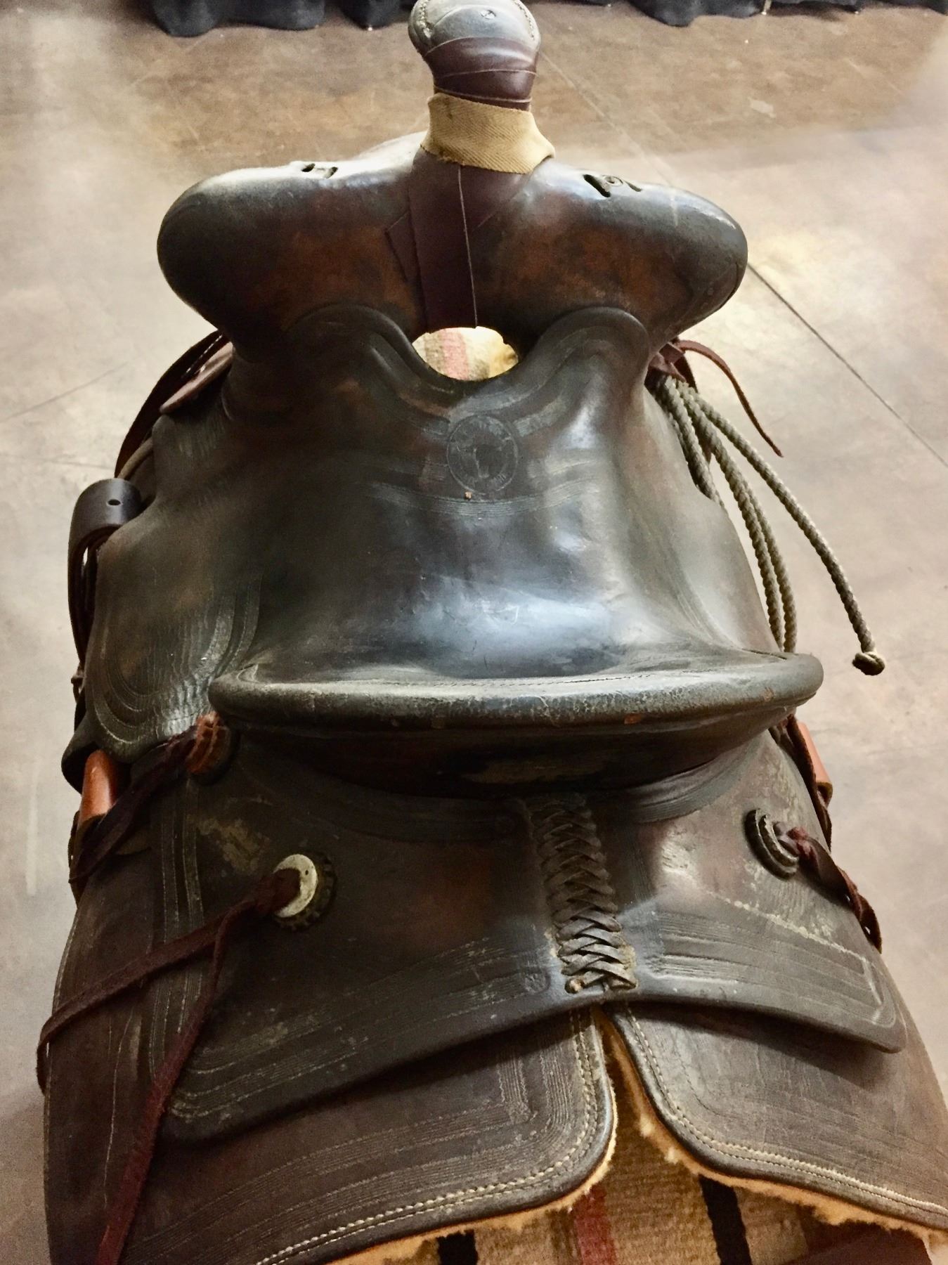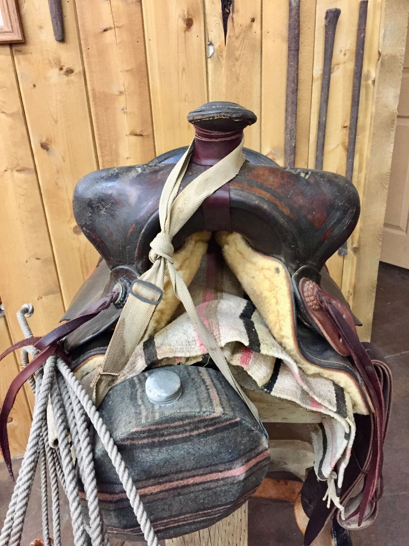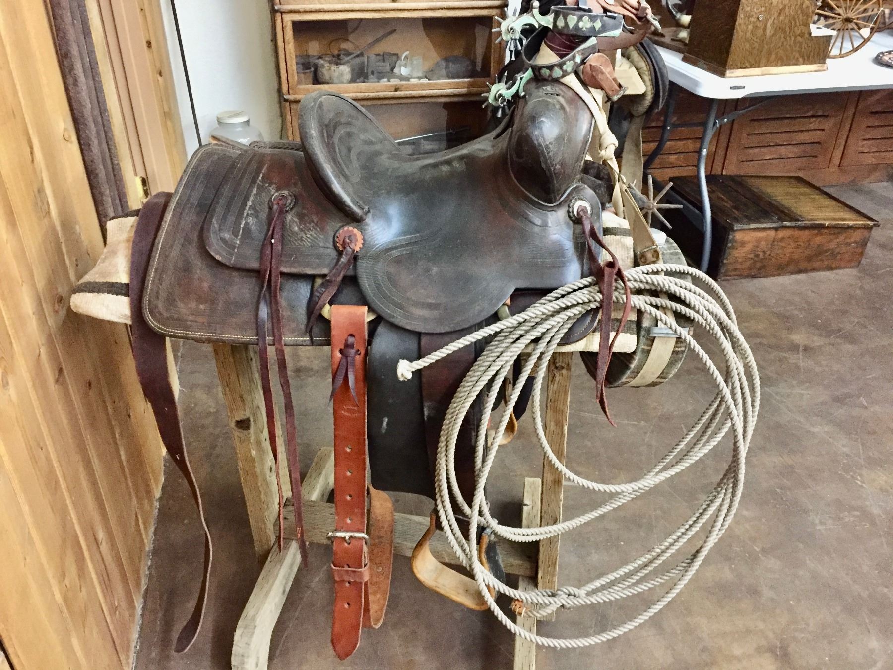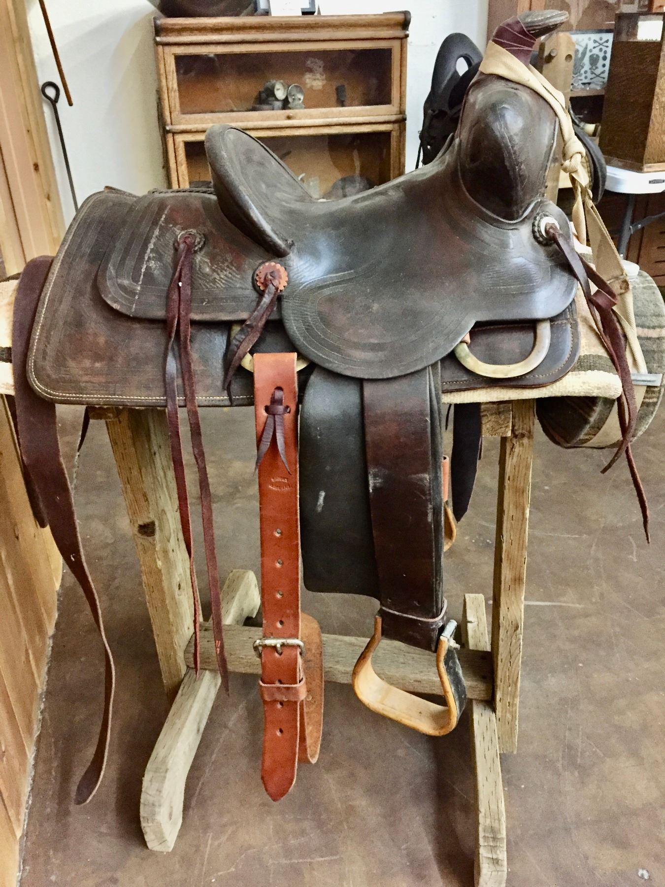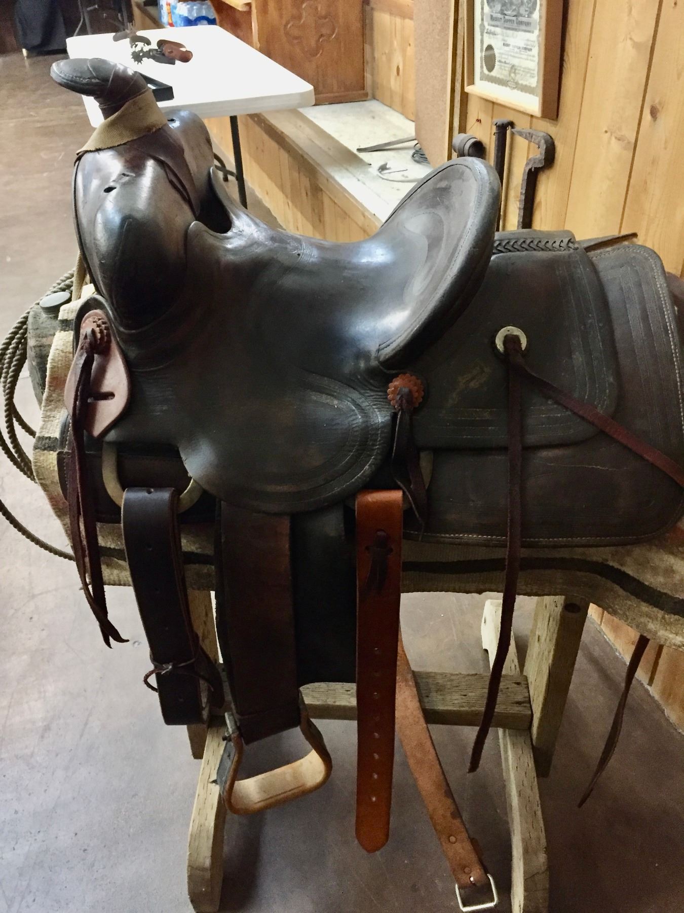 Description: Featured for sale in this lot is a C.P. Shipley Saddle with decorations and two pairs of spurs. You get all of the items in this display! Maker: C.P. Shipley on the saddle. Approx. Age: Vintage. Size: 11-1/2” seat. Spurs 3” heel and 3”1/2” shank, Spurs 3-1/2” heel and 4” shank. Condition: Good for their age, normal wear expected. Please look closely at the pictures - they are an important part of our description. Shipping: There will be a $15 handling / packaging fee for shipping this lot. The actual cost of postage will be added on top of that.