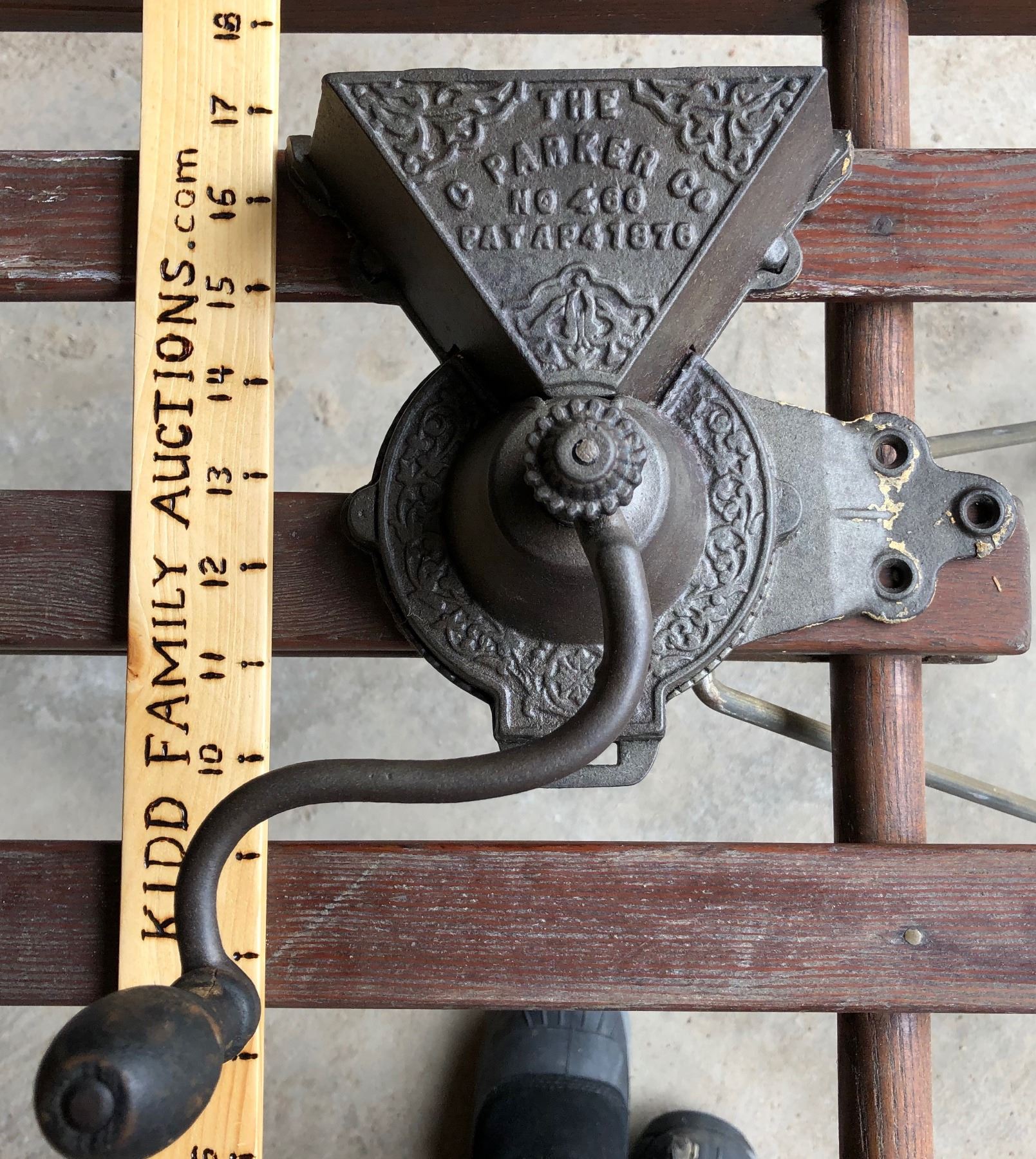 C PARKER MODEL #460 CAST WALL MOUNT COFFEE GRINDER, PATENT 1876