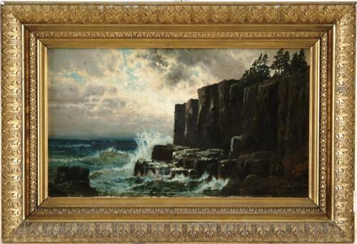 C PHILLIP WEBER (American, 1849-1921) GRAND MANAN. Oil on canvas coastal scene shows waves crashing on stepped rocky cliff with pine tree top. Light shines through break in gray and white clouds. Signed lower right ""C. Ph. Weber"". Housed in its original period gesso decorated frame with leaf motif. SIZE: 10in. x 17in.. CONDITION: Very good. 9-25792