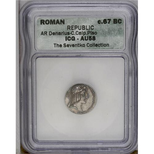 <B>C. Piso L. f. Frugi. </B></I> 67 B.C. AR denarius (17 mm). Laureate head of Apollo right / Horseman galloping right, holding palm branch. Crawford 408/1a; Sydenham 850c; Calpurnia 24g. AU58 ICG. <I>Ex Seventko Collection (HWCA 296, 29 July 2002), 11230; CNA XIV (20 March 1991), 701.</B></I>