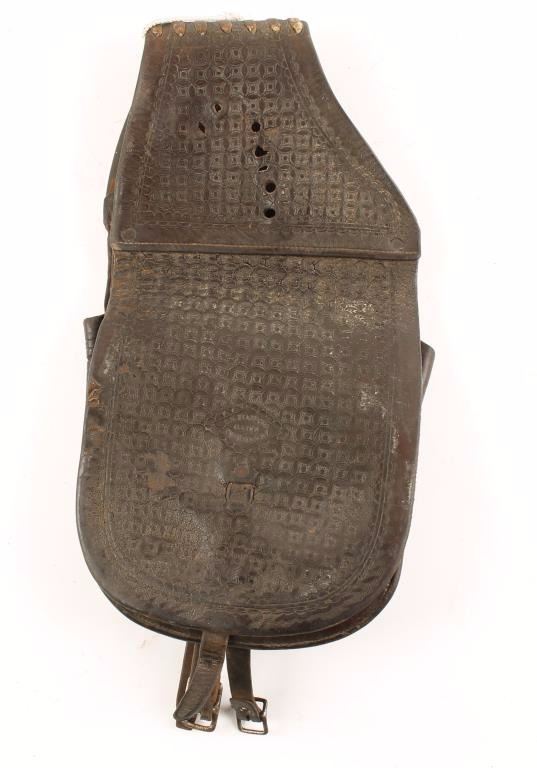 Made in Lewistown Montana maker marked once, brown leather with circular stamping. In fair condition, shows some cracking and use.