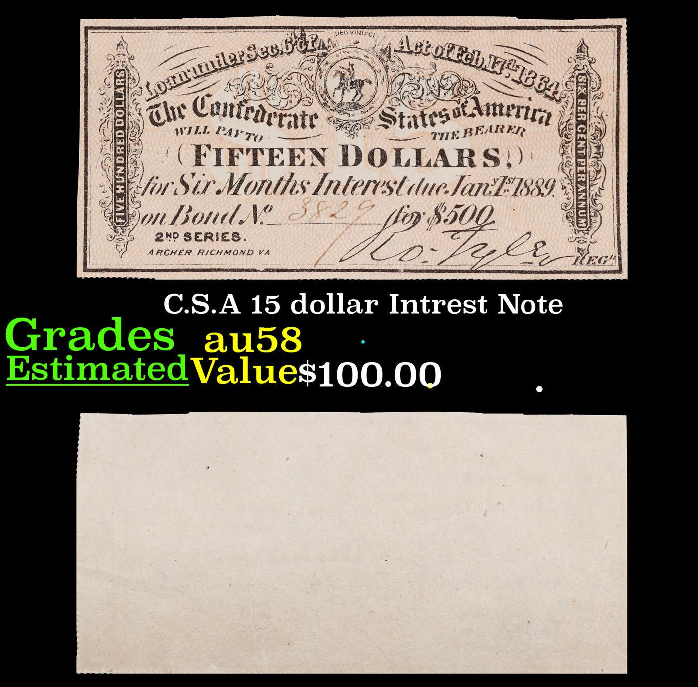 C.S.A 15 dollar Intrest Note Grades Choice AU/BU Slider.