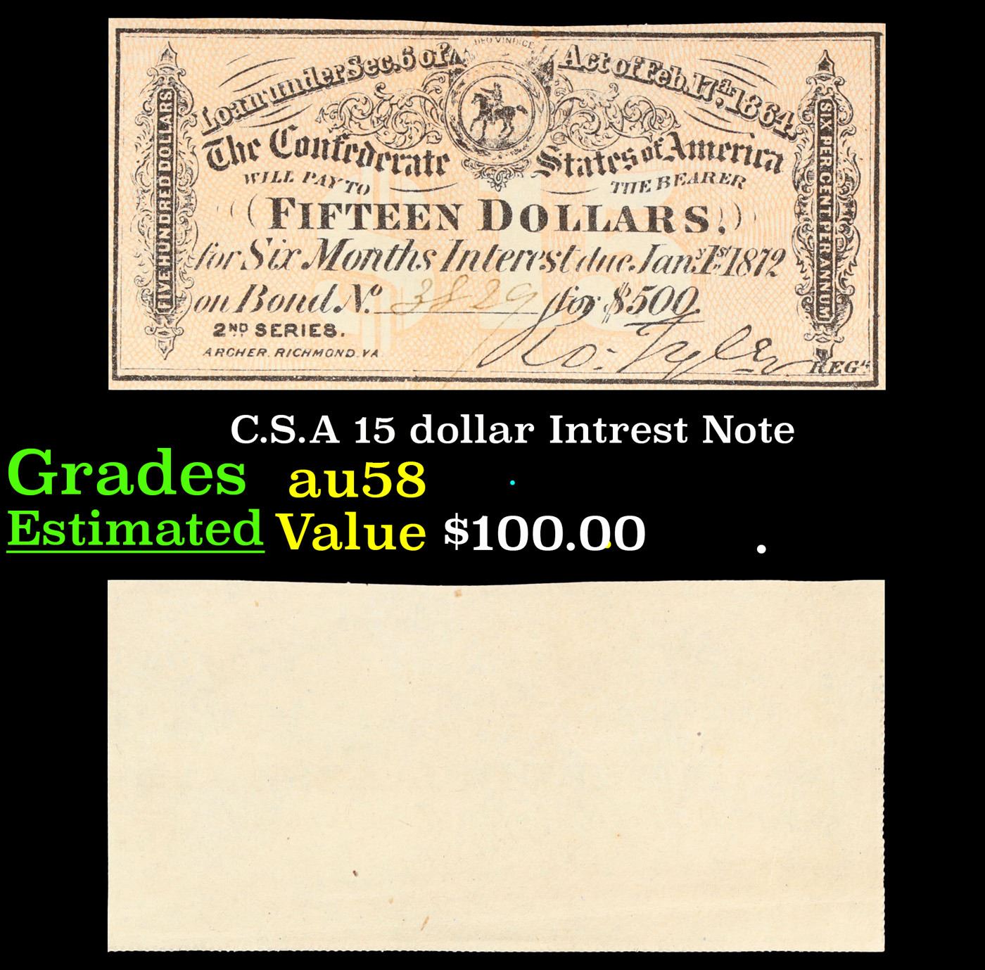 C.S.A 15 dollar Intrest Note Grades Choice AU/BU Slider.