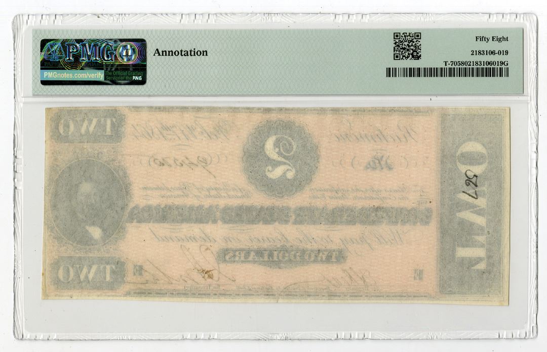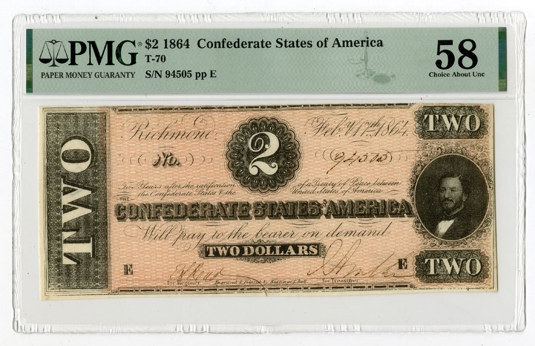 Richmond, Virginia, 1864. $2, T-70, P-66b, Black on Red underprint, Portrait of J. P. Benjamin at right, S/N 94505 pp E, PMG graded Choice About Uncirculated 58 with comment "Annotations," Keatinge & Ball.