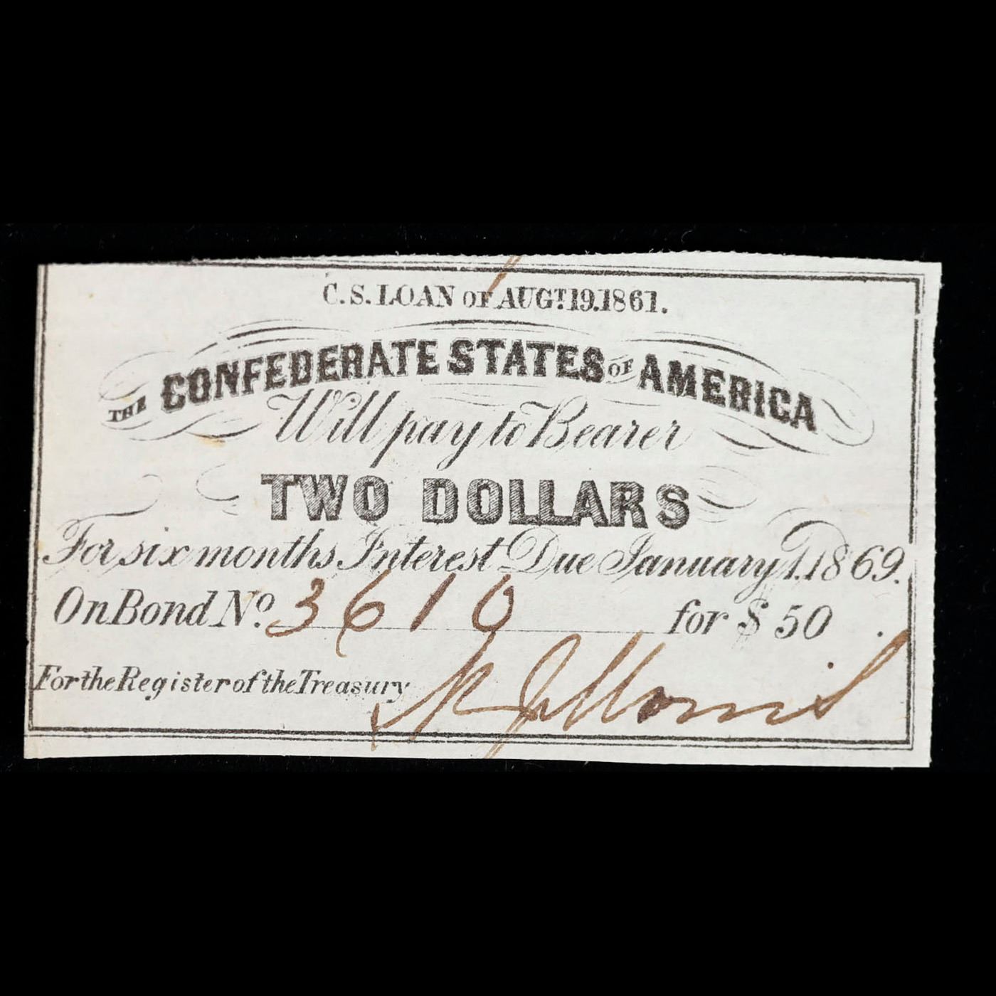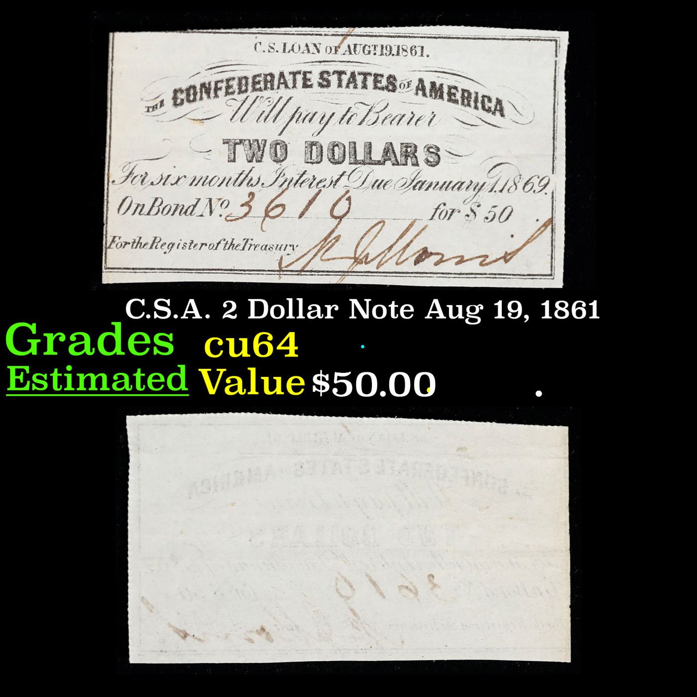 C.S.A. 2 Dollar Note Aug 19, 1861 Grades Choice CU