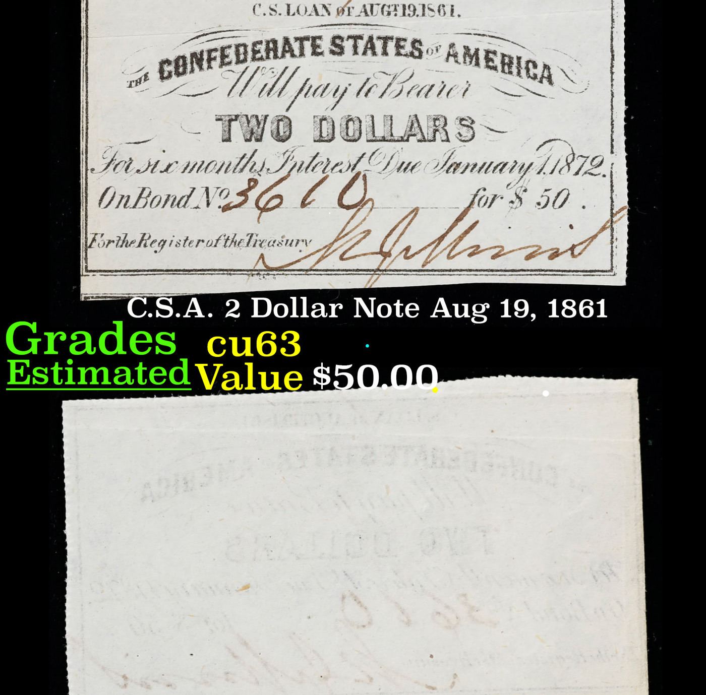 C.S.A. 2 Dollar Note Aug 19, 1861 Grades Select CU.