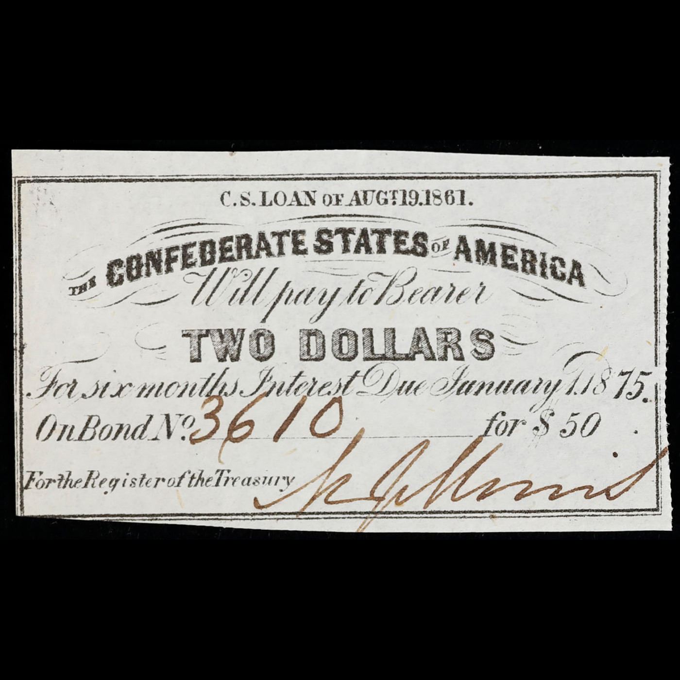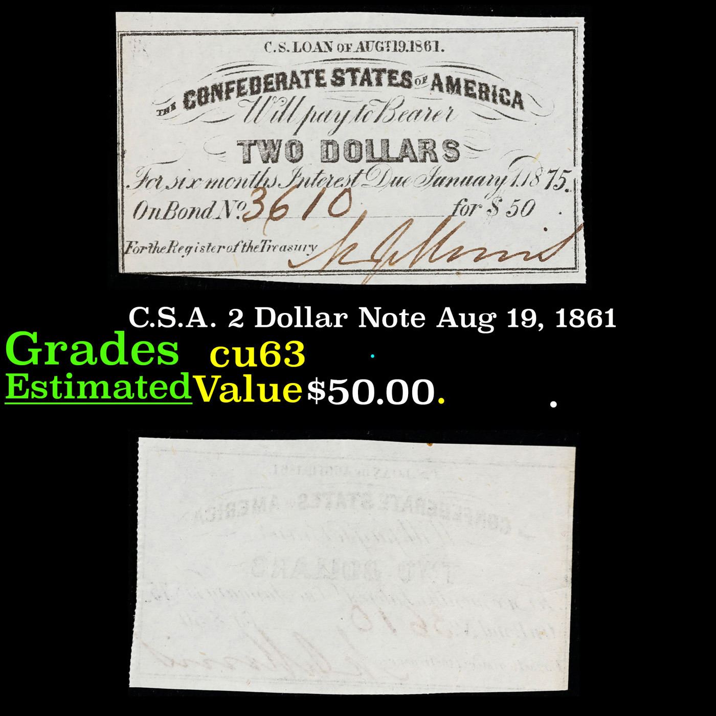 C.S.A. 2 Dollar Note Aug 19, 1861 Grades Select CU.