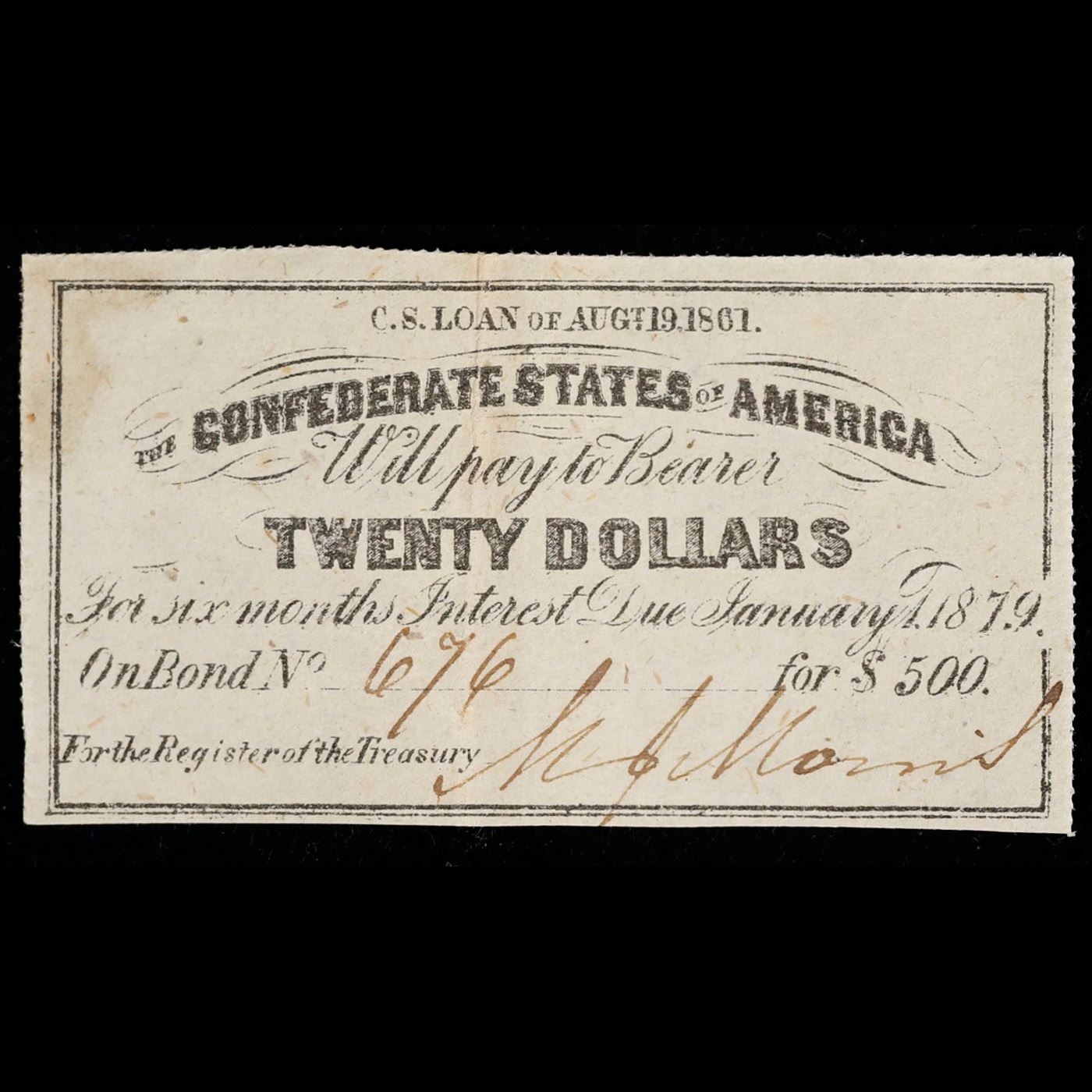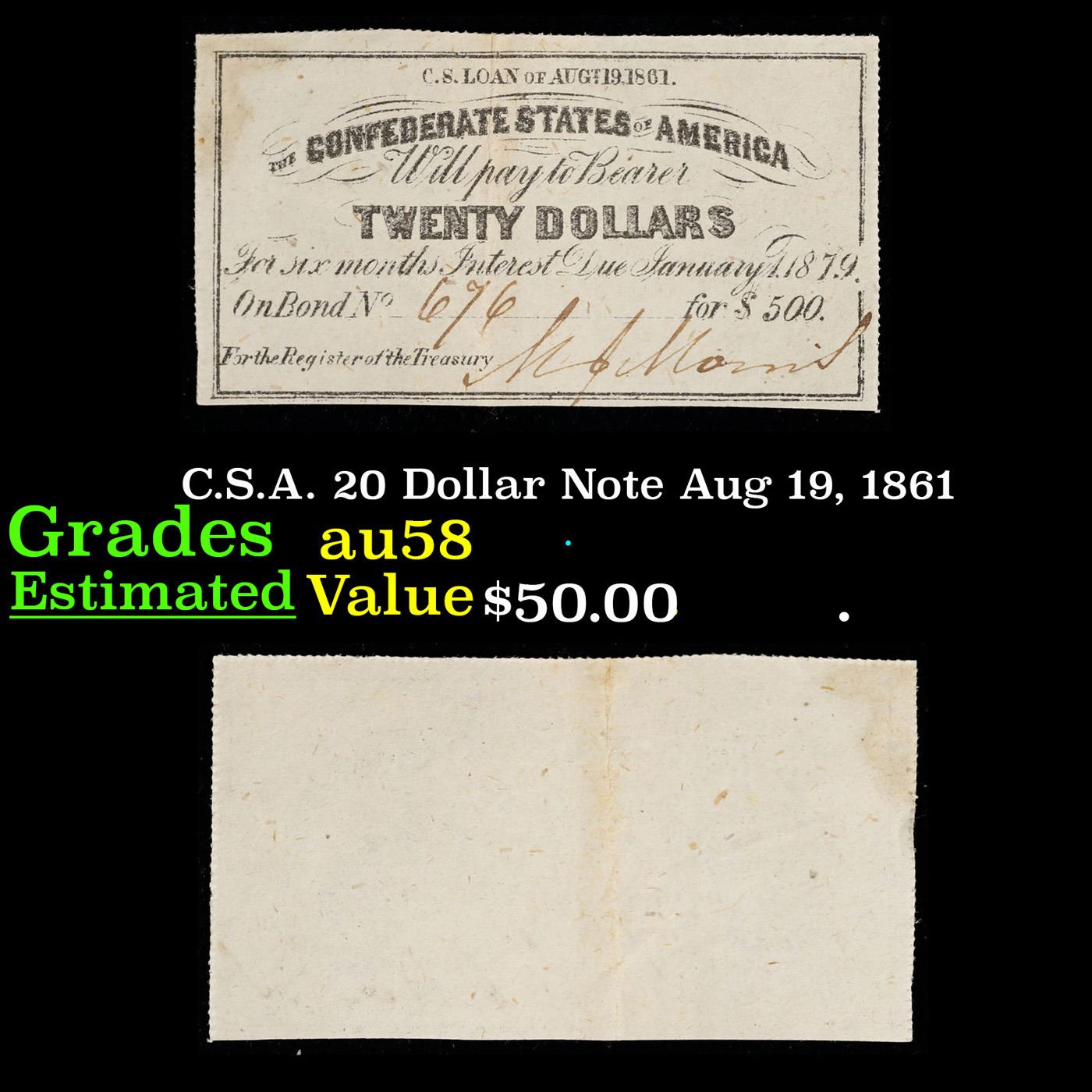 C.S.A. 20 Dollar Note Aug 19, 1861 Grades Choice AU/BU Slider