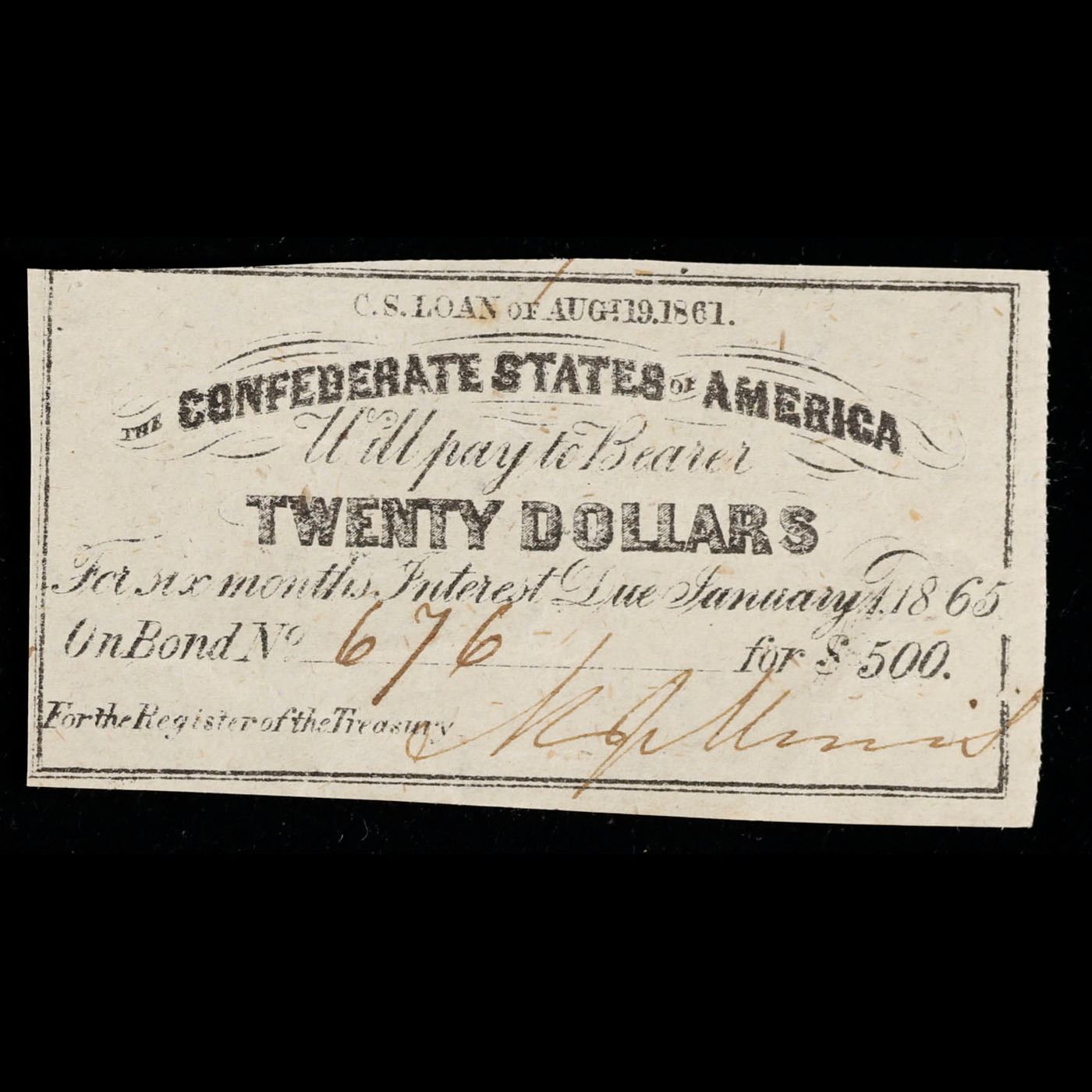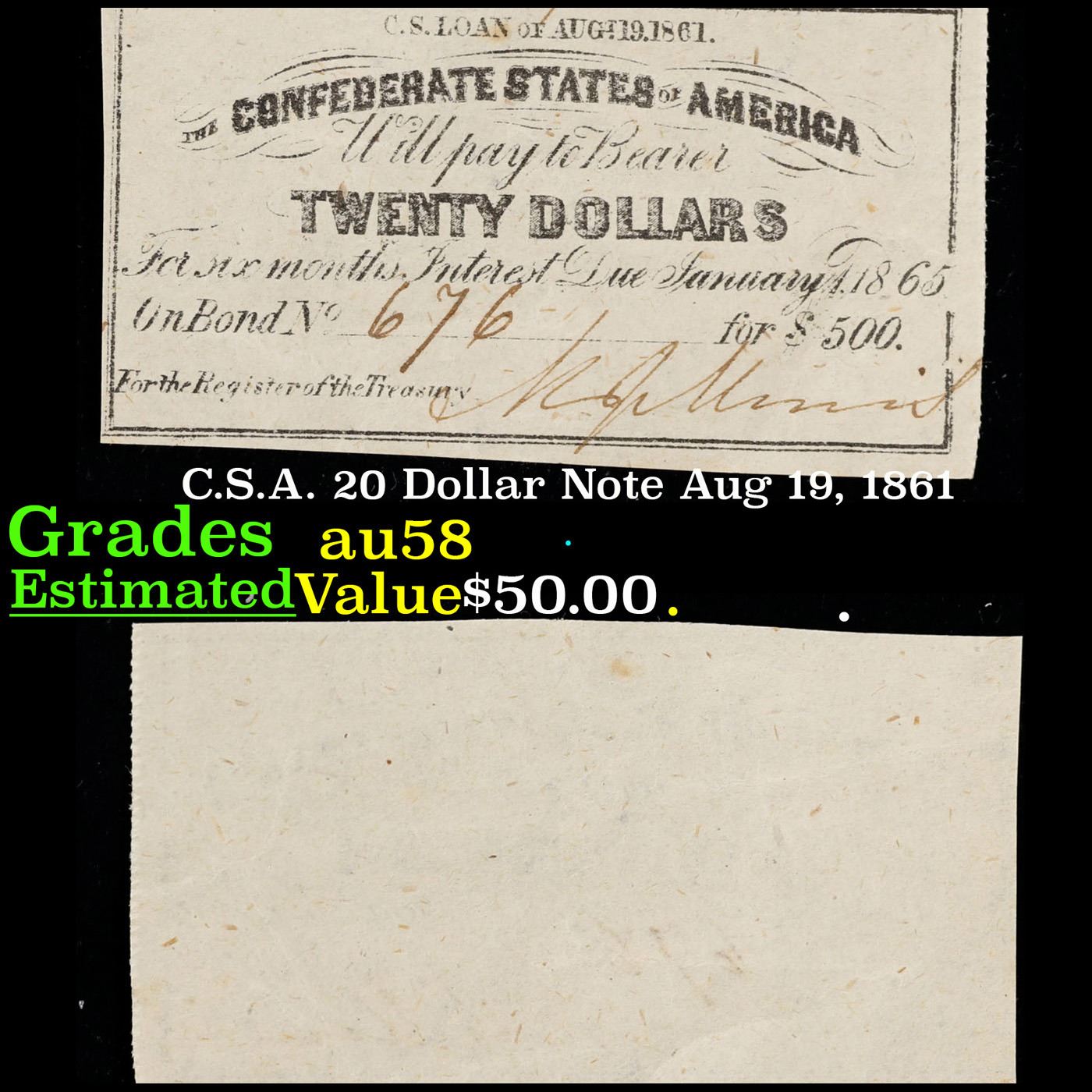 C.S.A. 20 Dollar Note Aug 19, 1861 Grades Choice AU/BU Slider.
