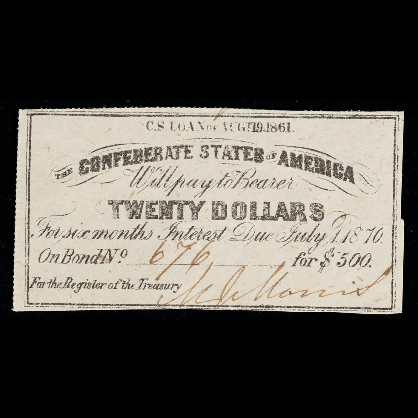 C.S.A. 20 Dollar Note Aug 19, 1861 Grades Select CU.