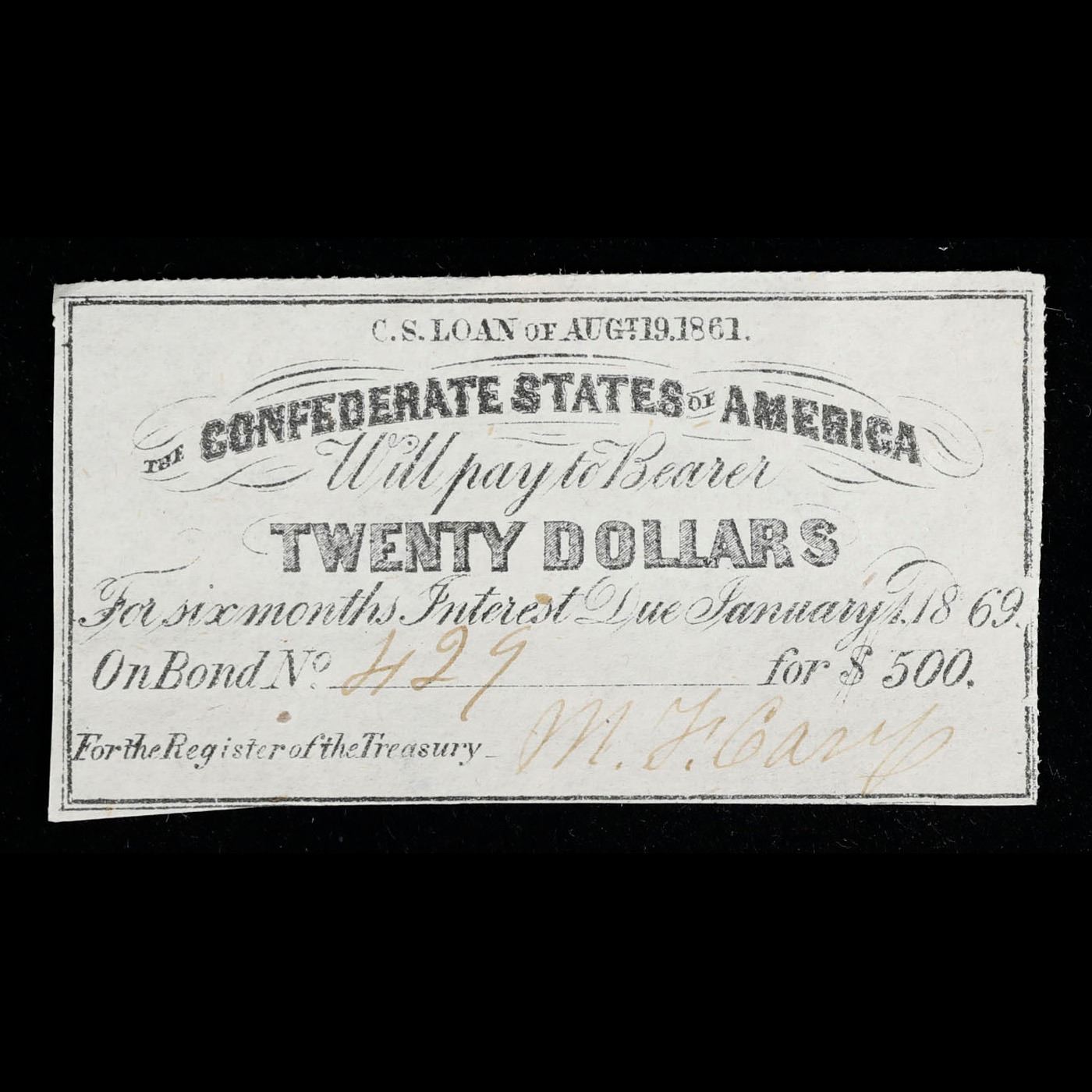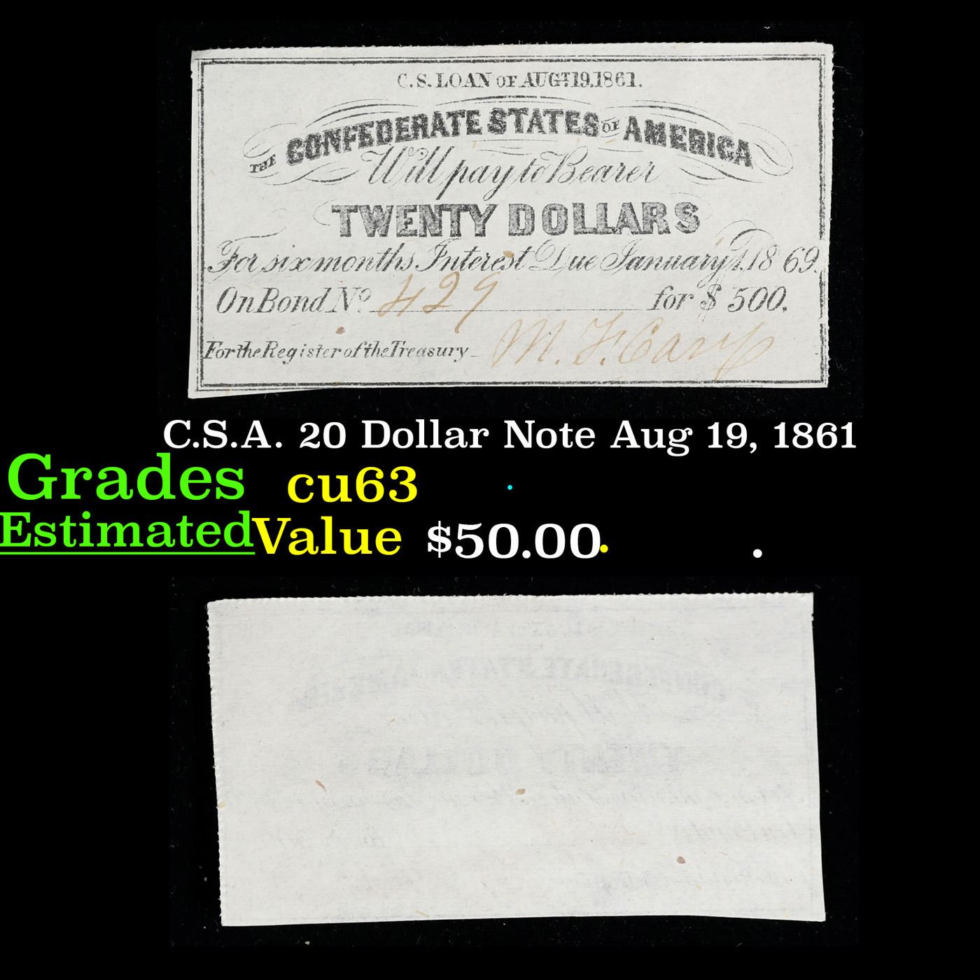 C.S.A. 20 Dollar Note Aug 19, 1861 Grades Select CU.