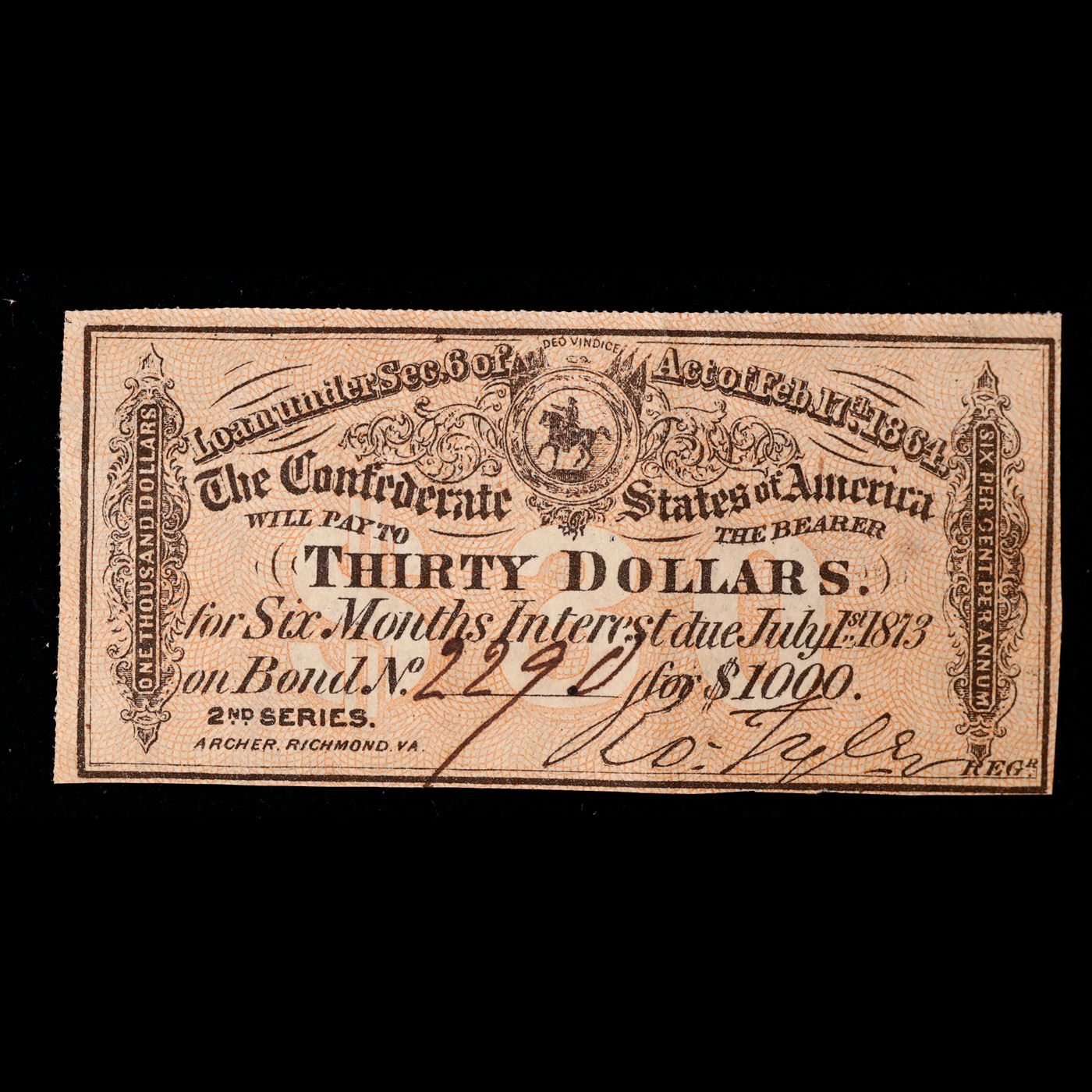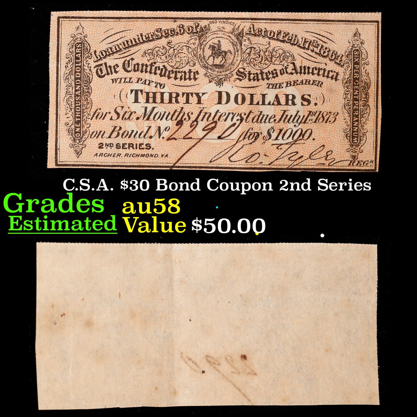 C.S.A. $30 Bond Coupon 2nd Series Grades Choice AU/BU Slider.