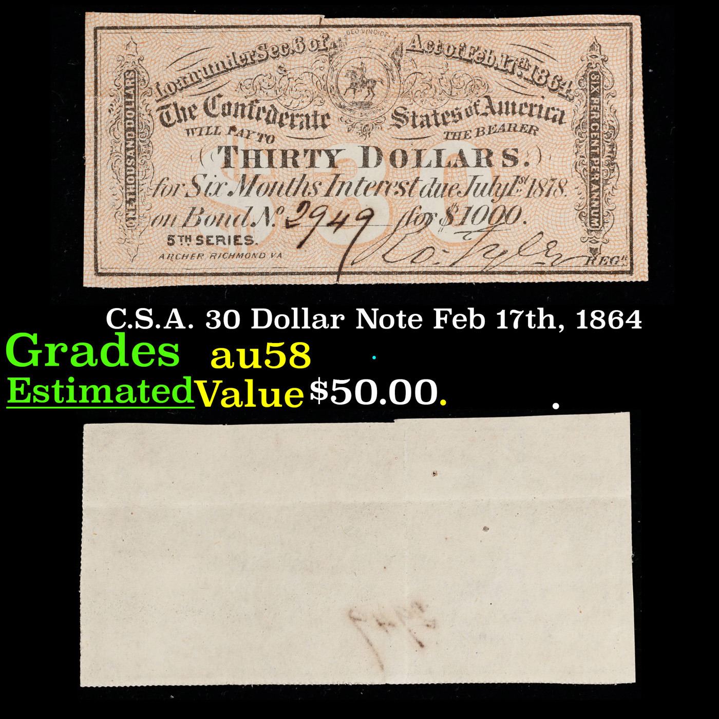 C.S.A. 30 Dollar Note Feb 17th, 1864 Grades Choice AU/BU Slider.
