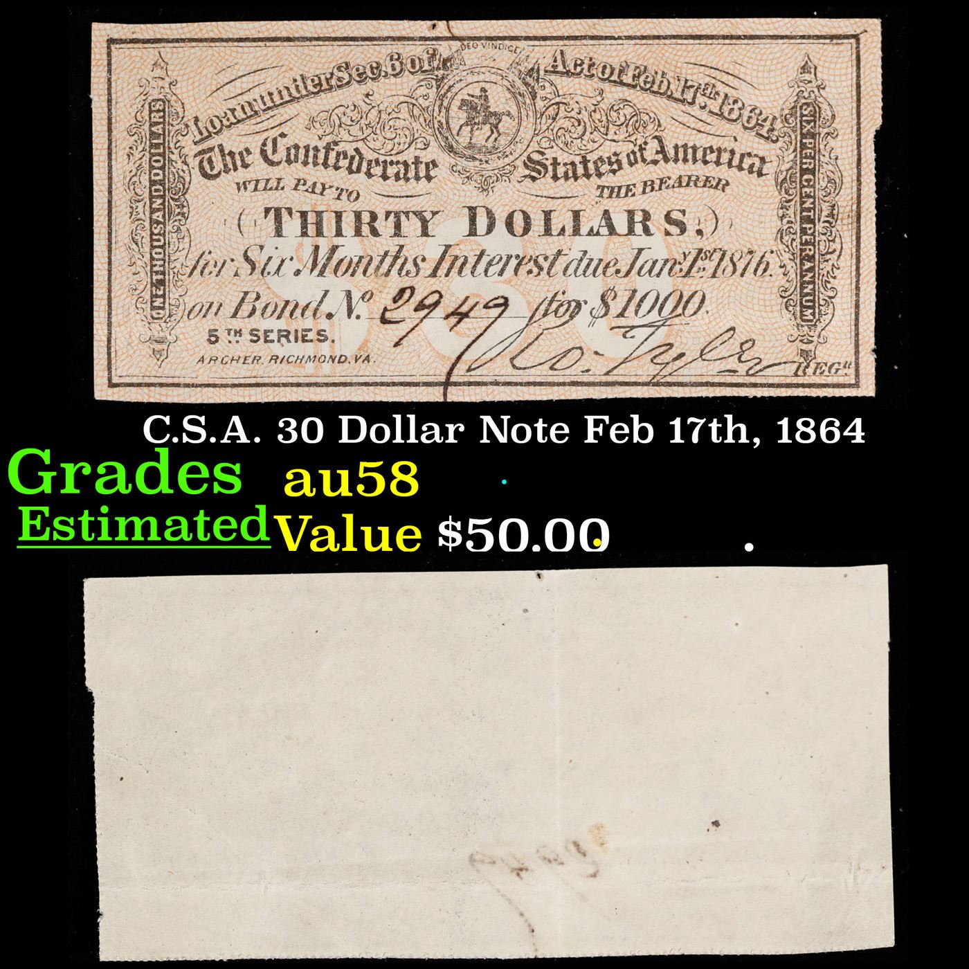C.S.A. 30 Dollar Note Feb 17th, 1864 Grades Choice AU/BU Slider