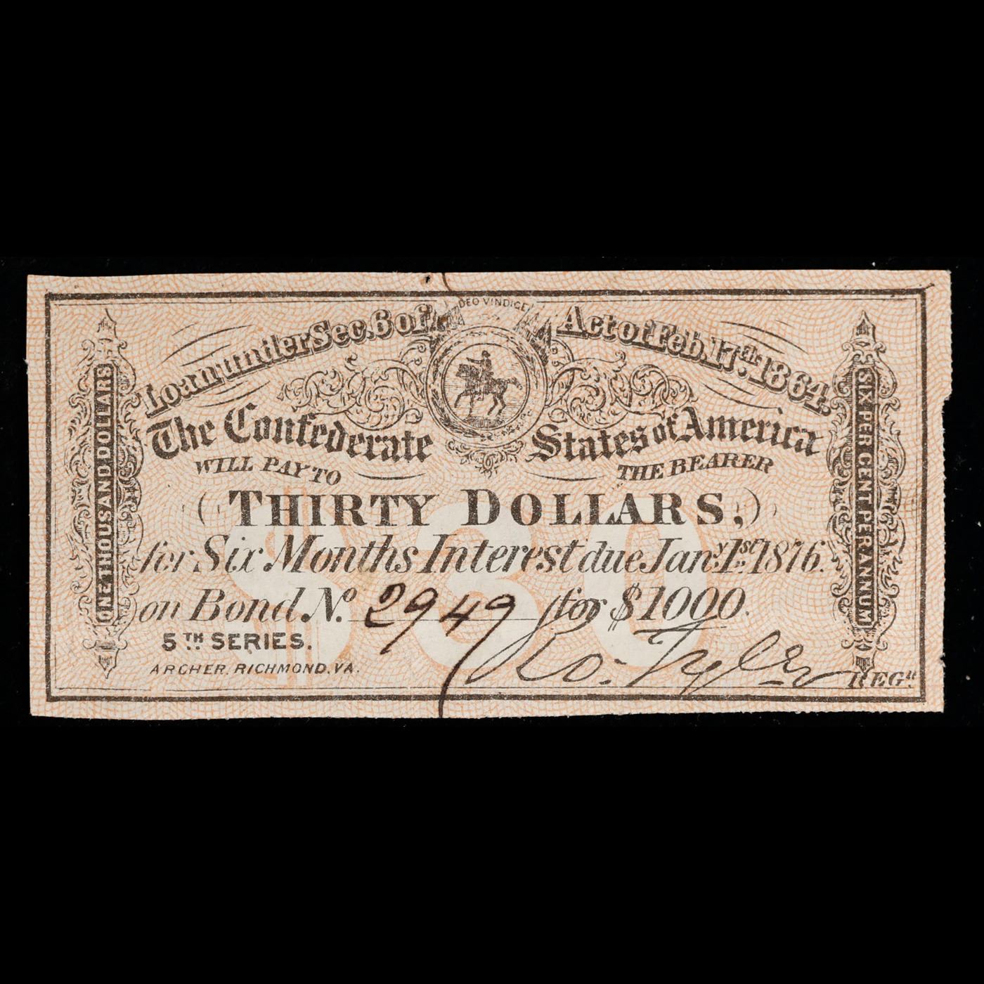 C.S.A. 30 Dollar Note Feb 17th, 1864 Grades Choice AU/BU Slider.
