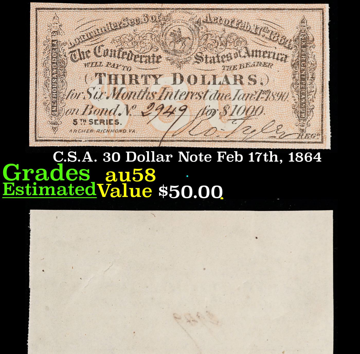 C.S.A. 30 Dollar Note Feb 17th, 1864 Grades Choice AU/BU Slider