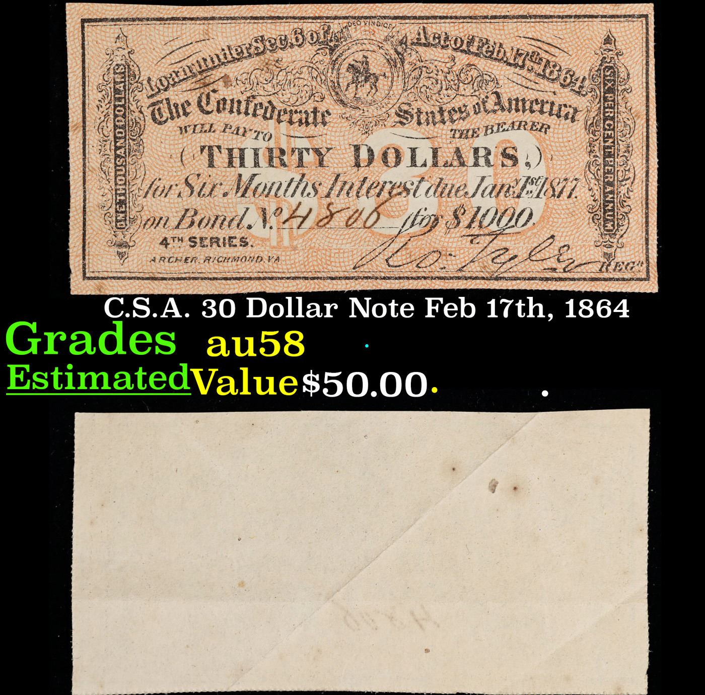 C.S.A. 30 Dollar Note Feb 17th, 1864 Grades Choice AU/BU Slider.