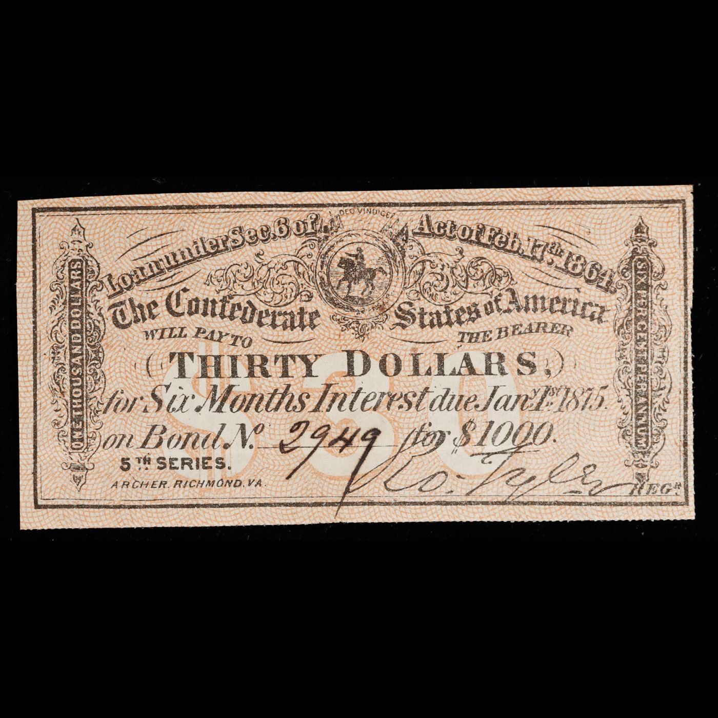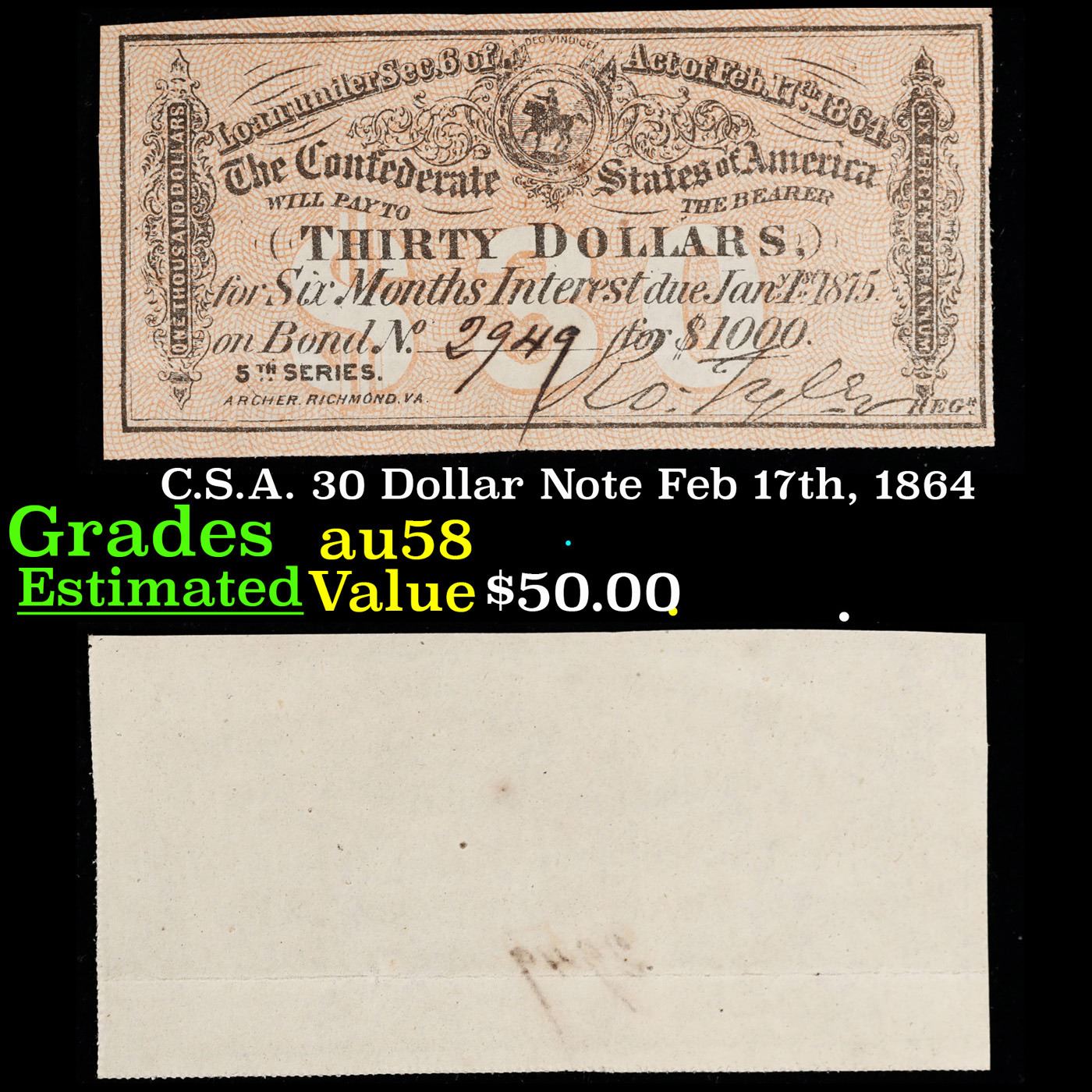 C.S.A. 30 Dollar Note Feb 17th, 1864 Grades Choice AU/BU Slider.