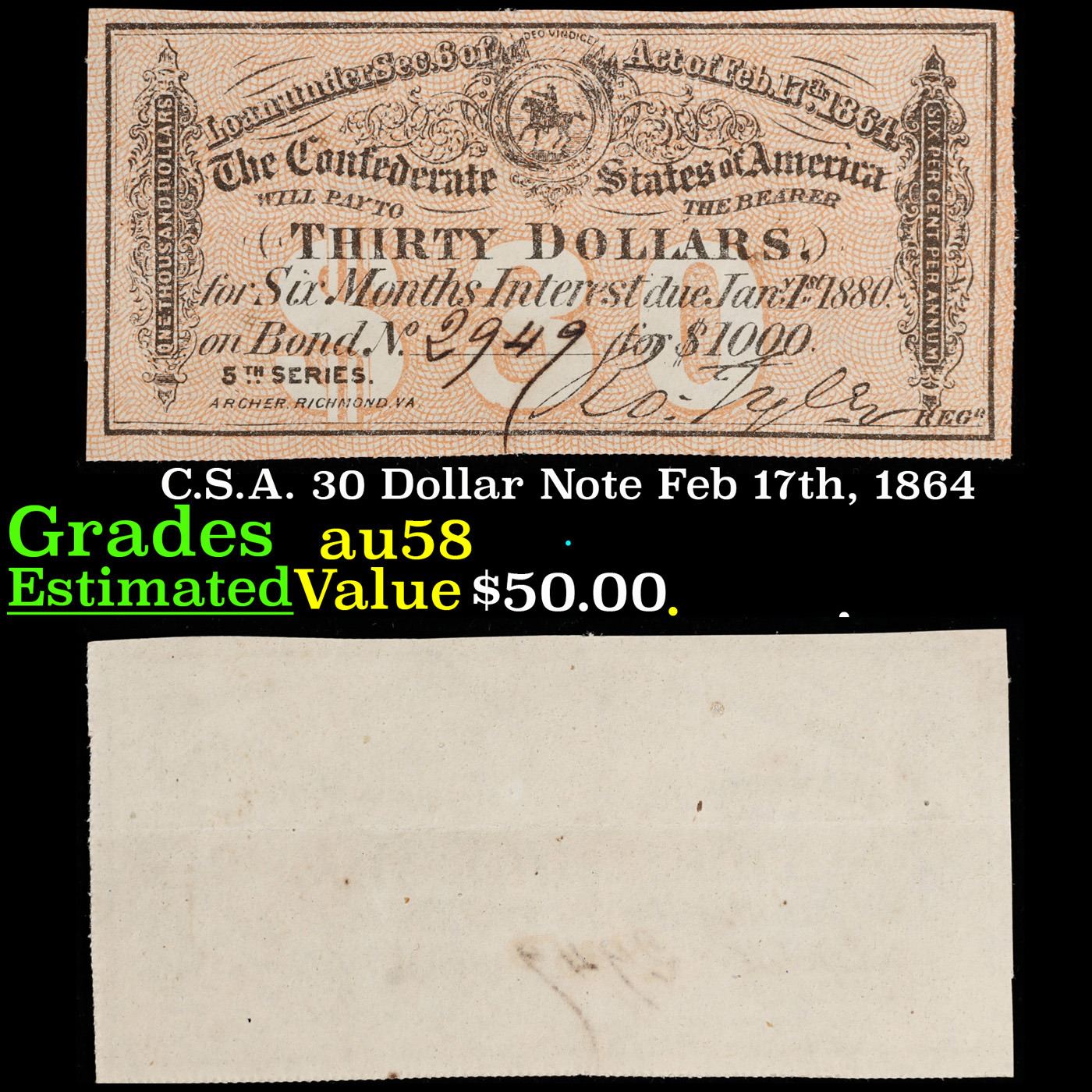 C.S.A. 30 Dollar Note Feb 17th, 1864 Grades Choice AU/BU Slider.