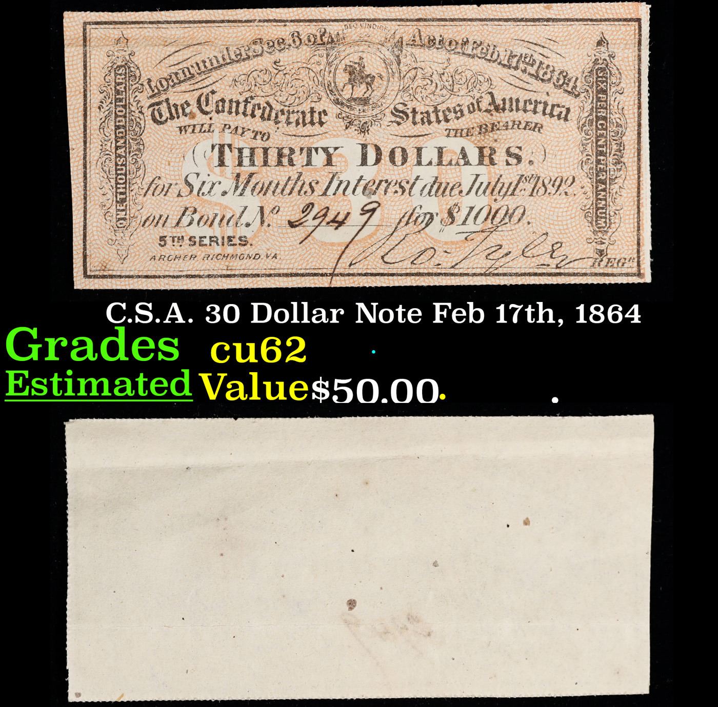 C.S.A. 30 Dollar Note Feb 17th, 1864 Grades Select CU.