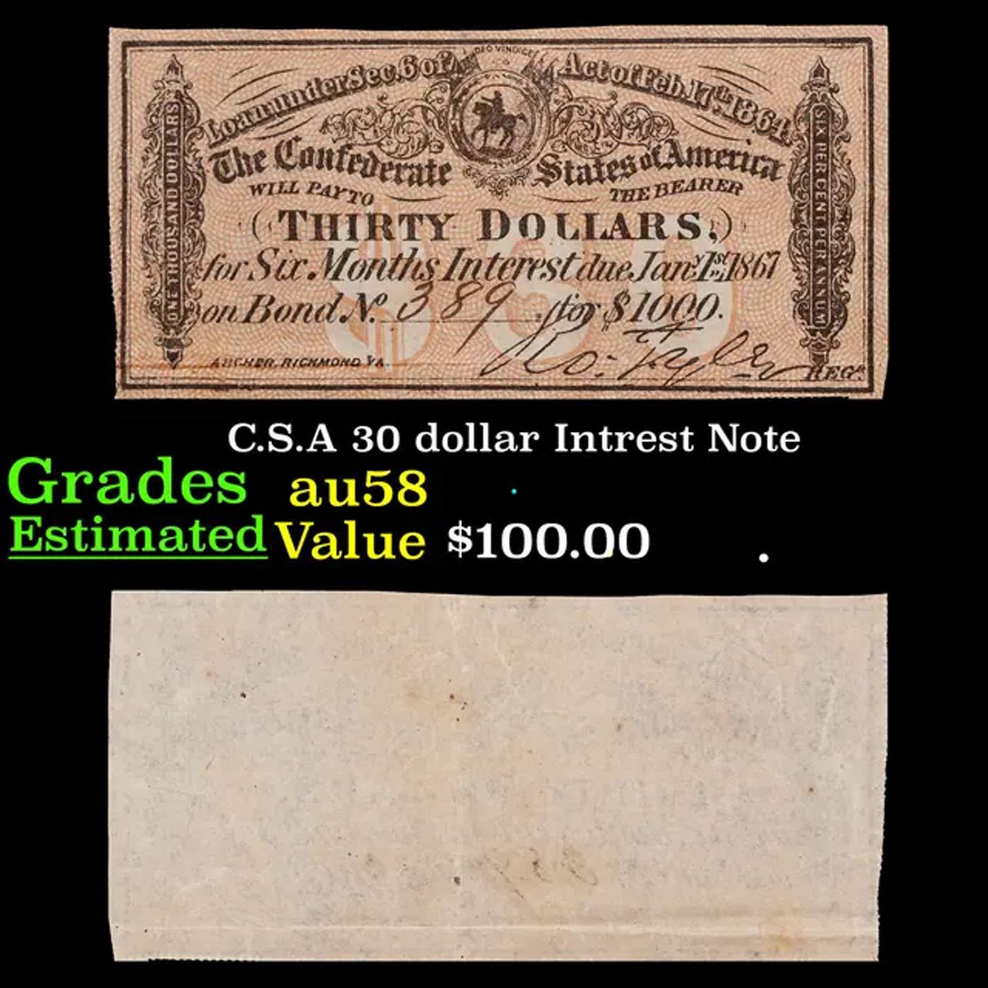 C.S.A 30 dollar Intrest Note Grades Choice AU/BU Slider.