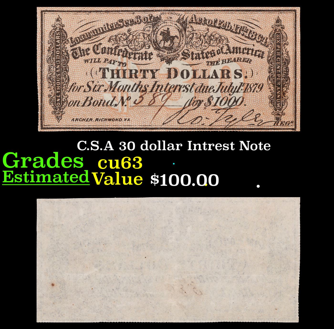 C.S.A 30 dollar Intrest Note Grades Select CU.