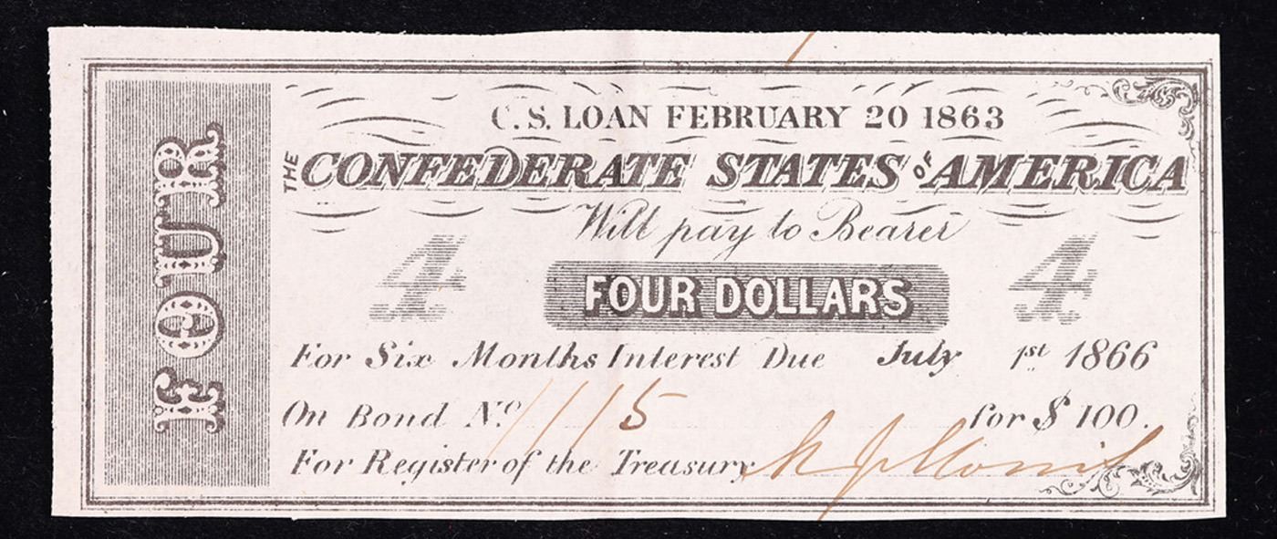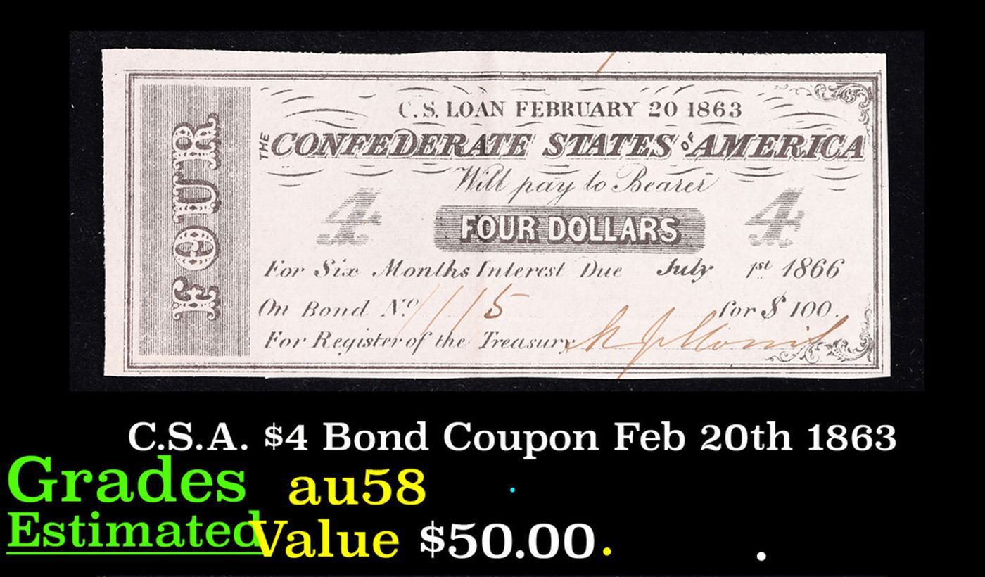C.S.A. $4 Bond Coupon Feb 20th 1863 Grades Choice AU/BU Slider.