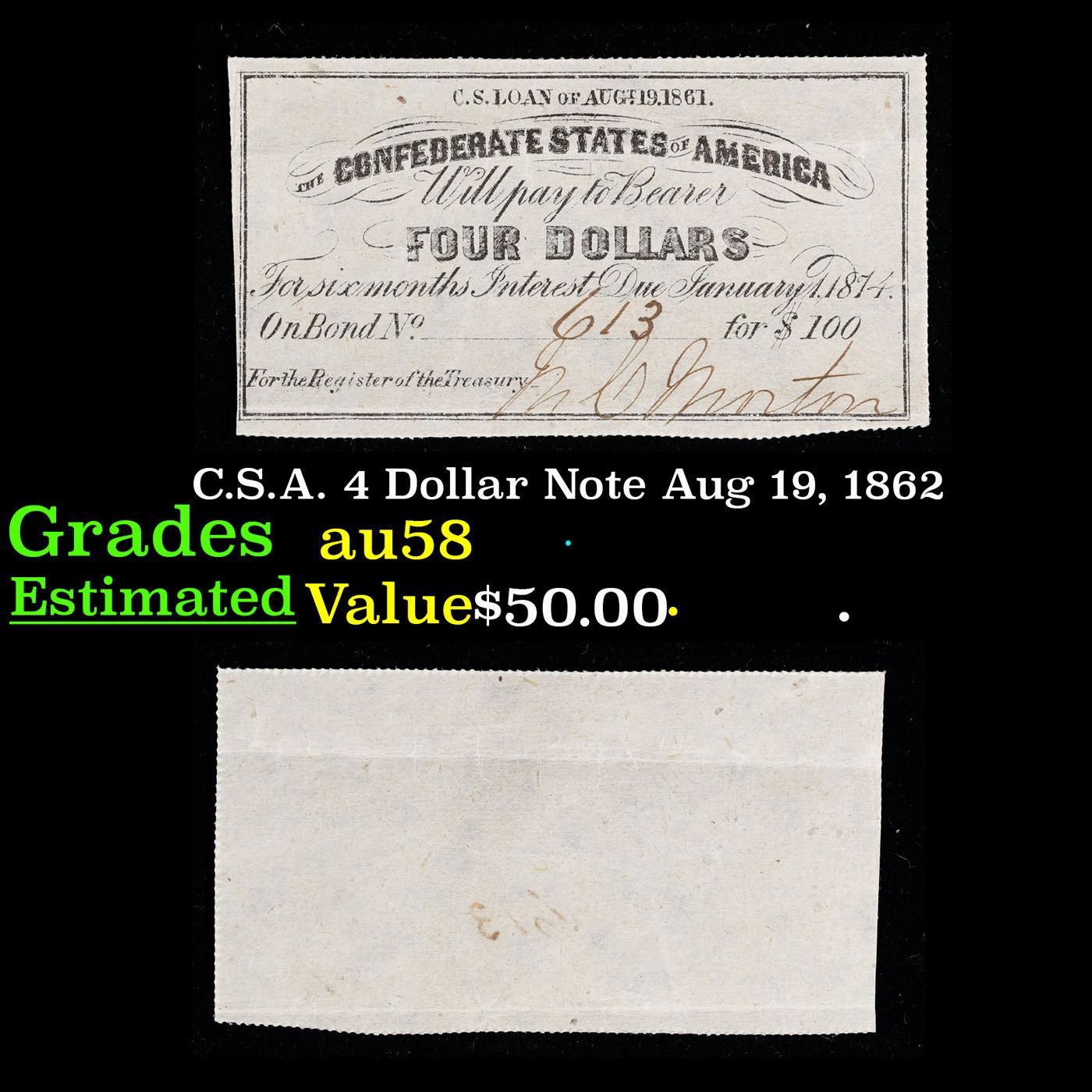 C.S.A. 4 Dollar Note Aug 19, 1862 Grades Choice AU/BU Slider.
