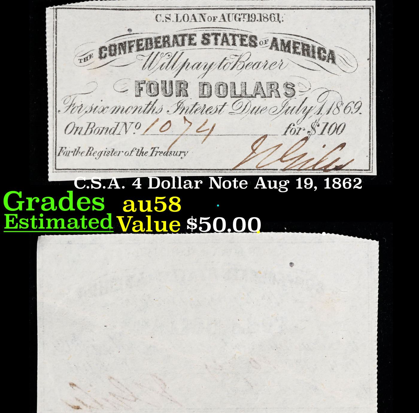 C.S.A. 4 Dollar Note Aug 19, 1862 Grades Choice AU/BU Slider.
