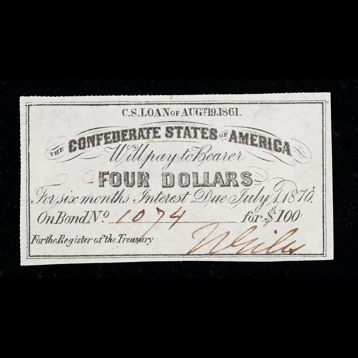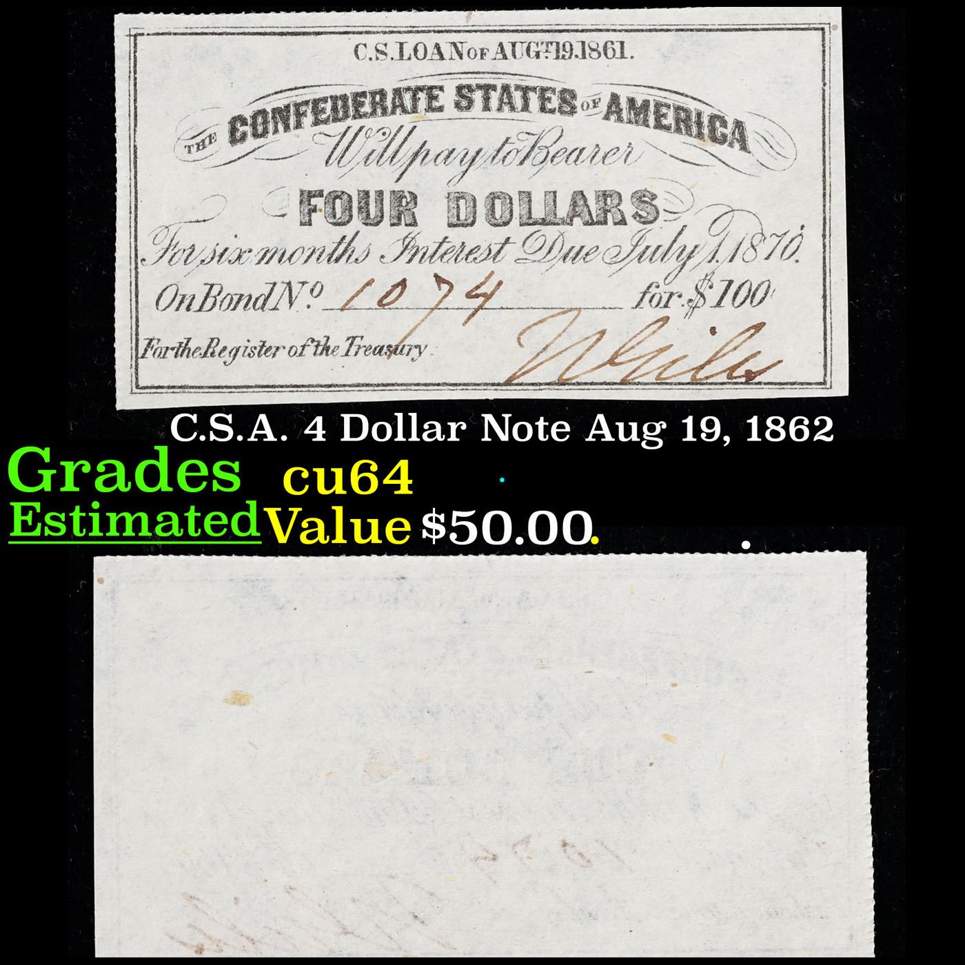 C.S.A. 4 Dollar Note Aug 19, 1862 Grades Choice CU.