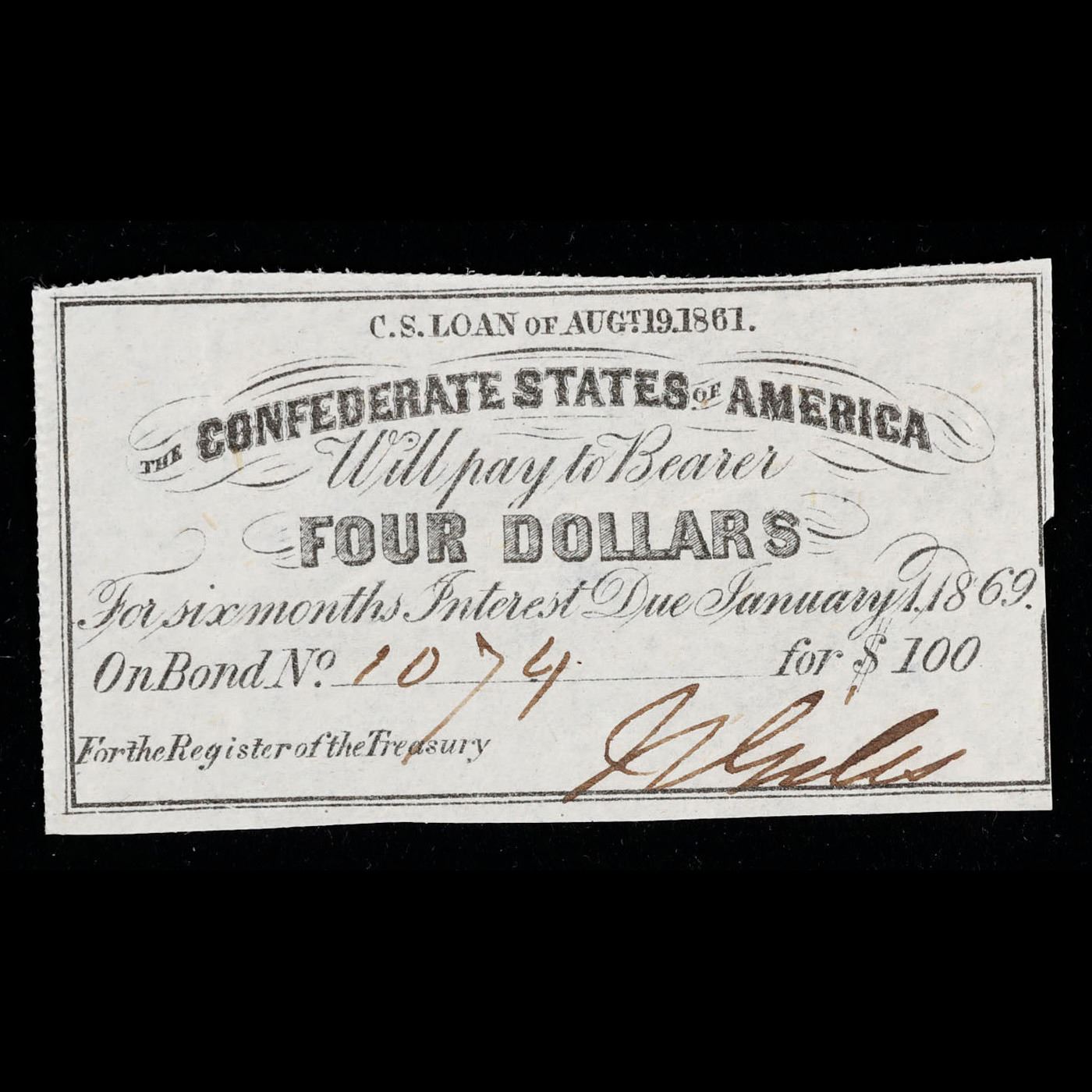 C.S.A. 4 Dollar Note Aug 19, 1862 Grades Select CU.