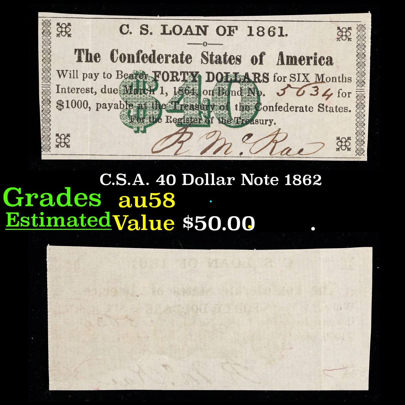 C.S.A. 40 Dollar Note 1862 Grades Choice AU/BU Slider.