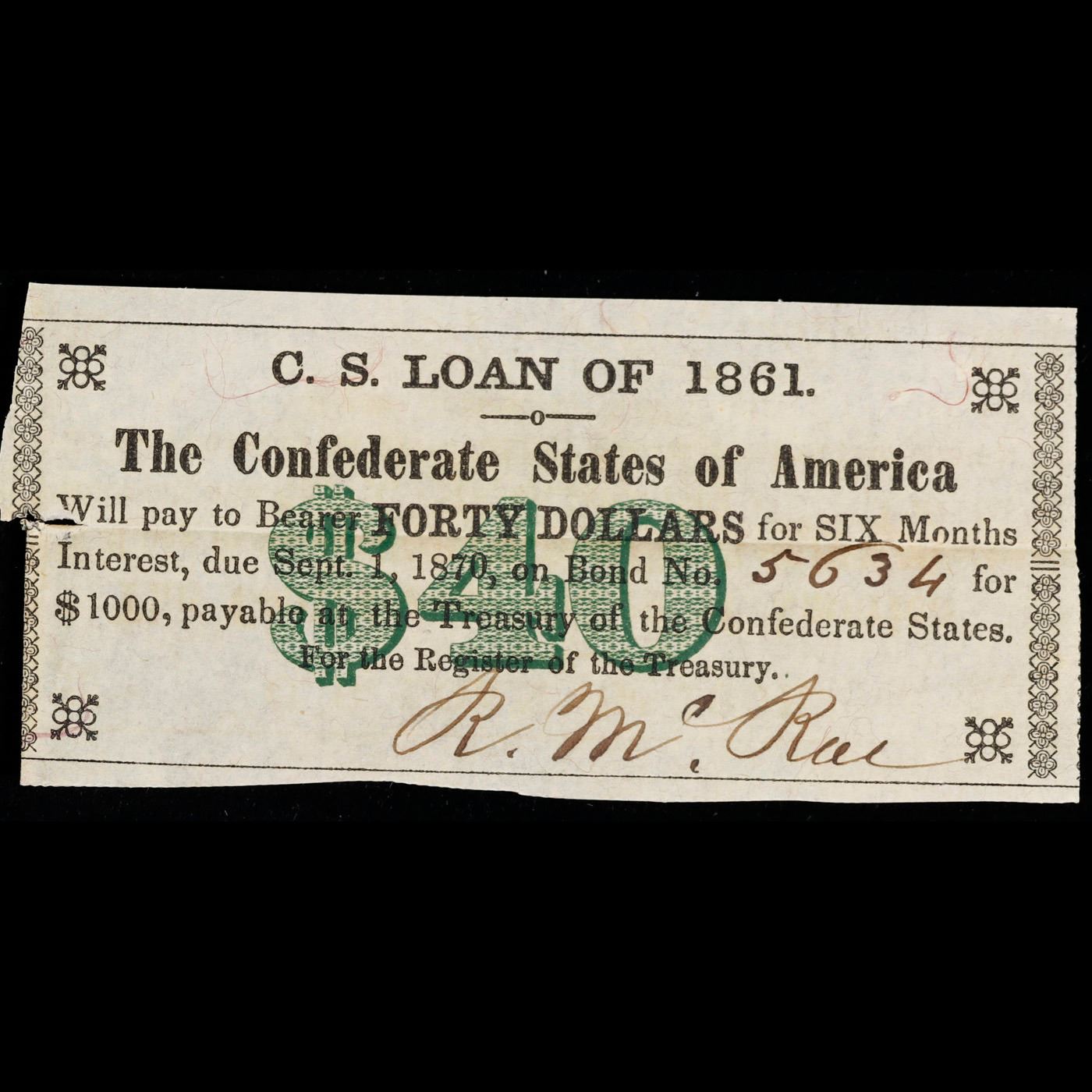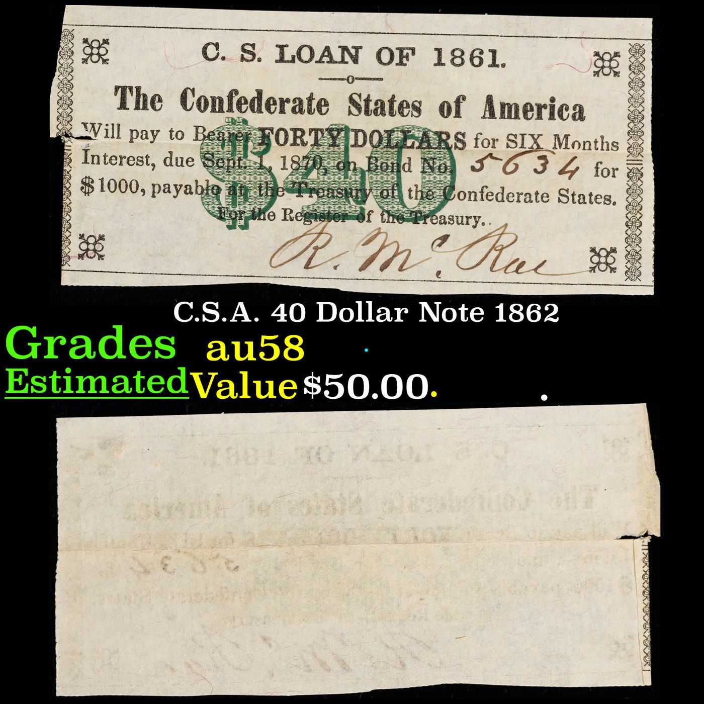 C.S.A. 40 Dollar Note 1862 Grades Choice AU/BU Slider.