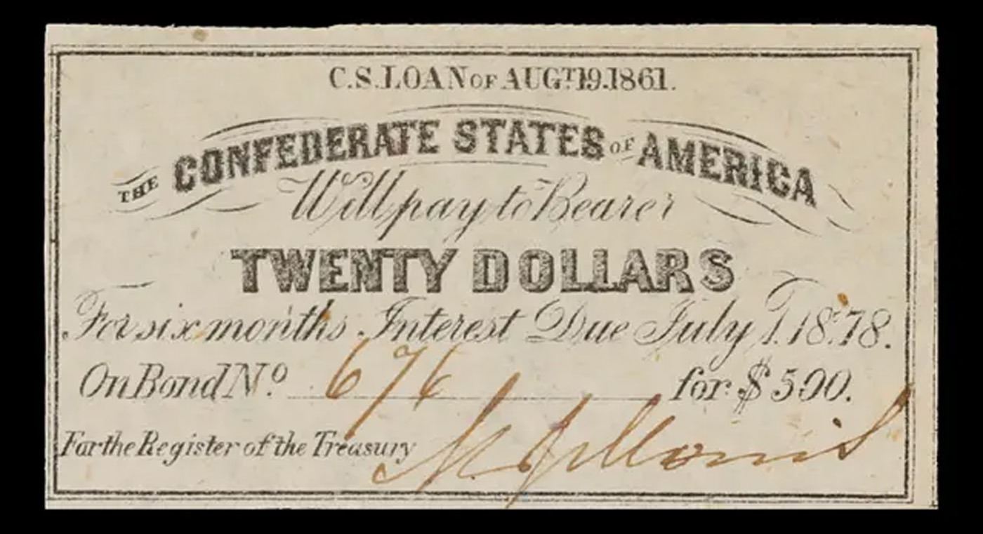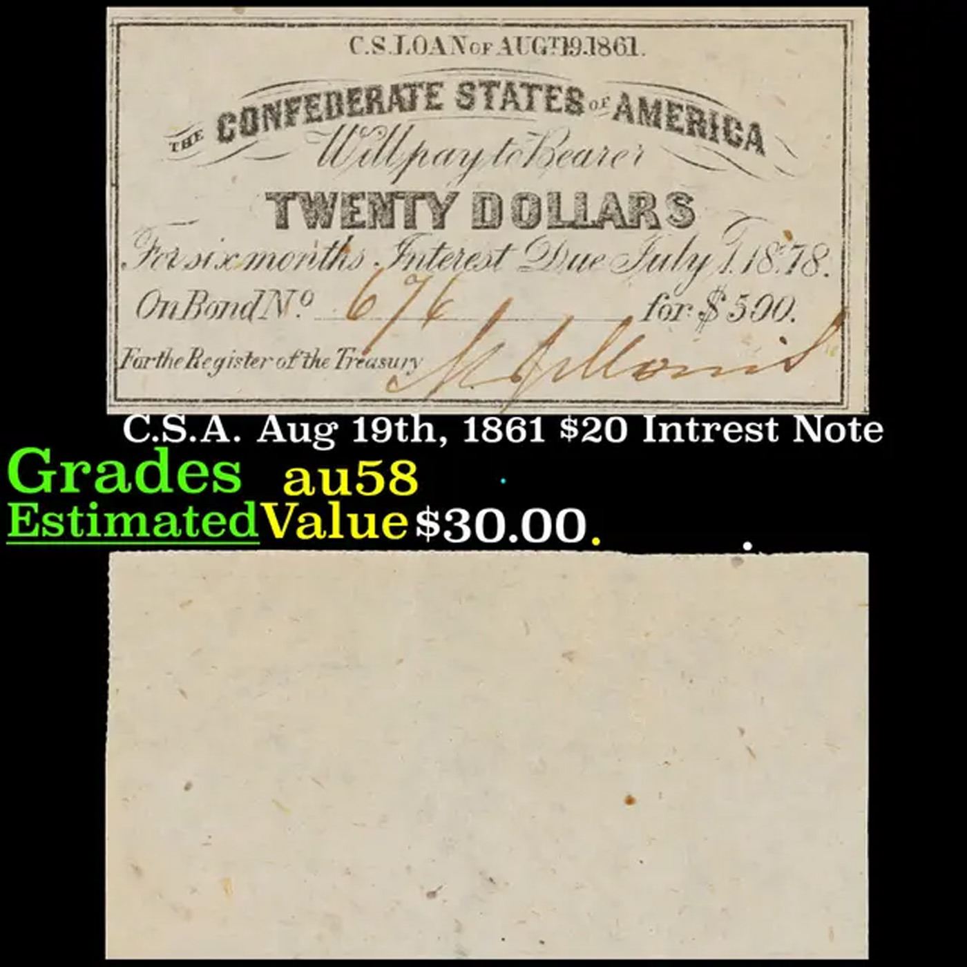 C.S.A. Aug 19th, 1861 $20 Intrest Note Grades Choice AU/BU Slider.