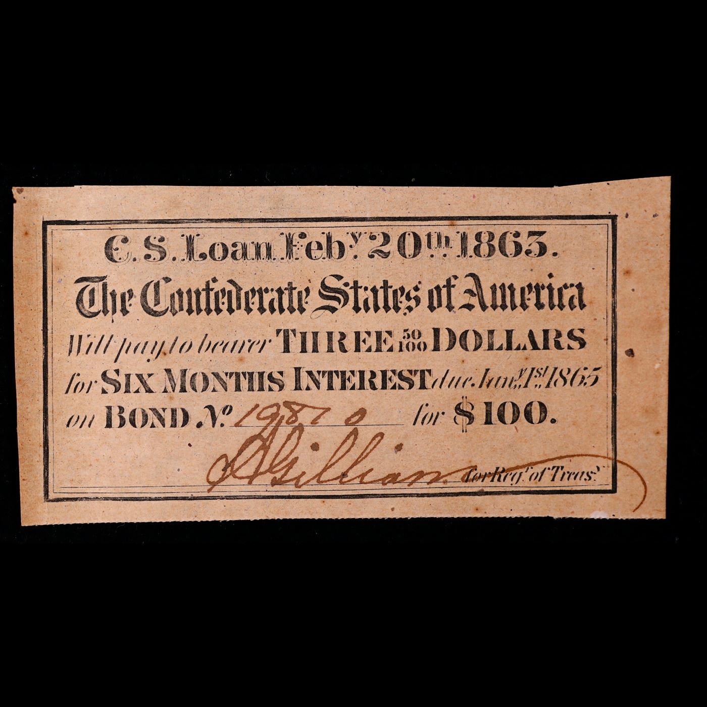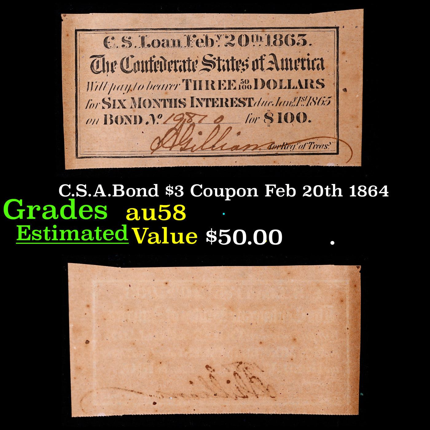 C.S.A.Bond $3 Coupon Feb 20th 1864 Grades Choice AU/BU Slider.