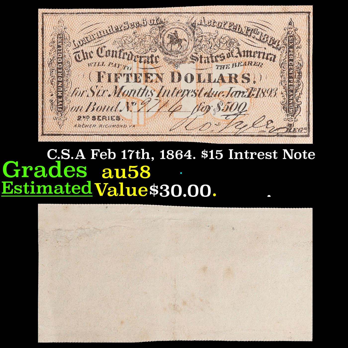 C.S.A Feb 17th, 1864. $15 Intrest Note Grades Choice AU/BU Slider