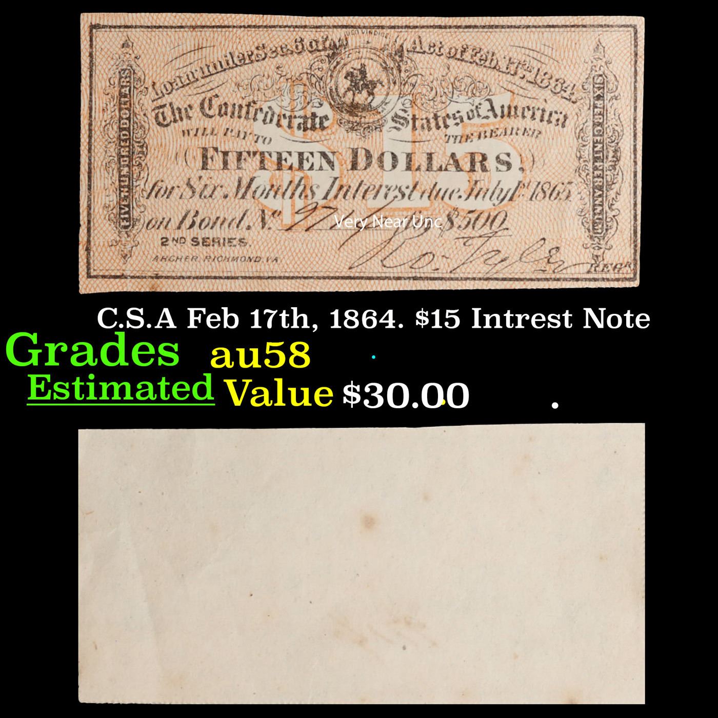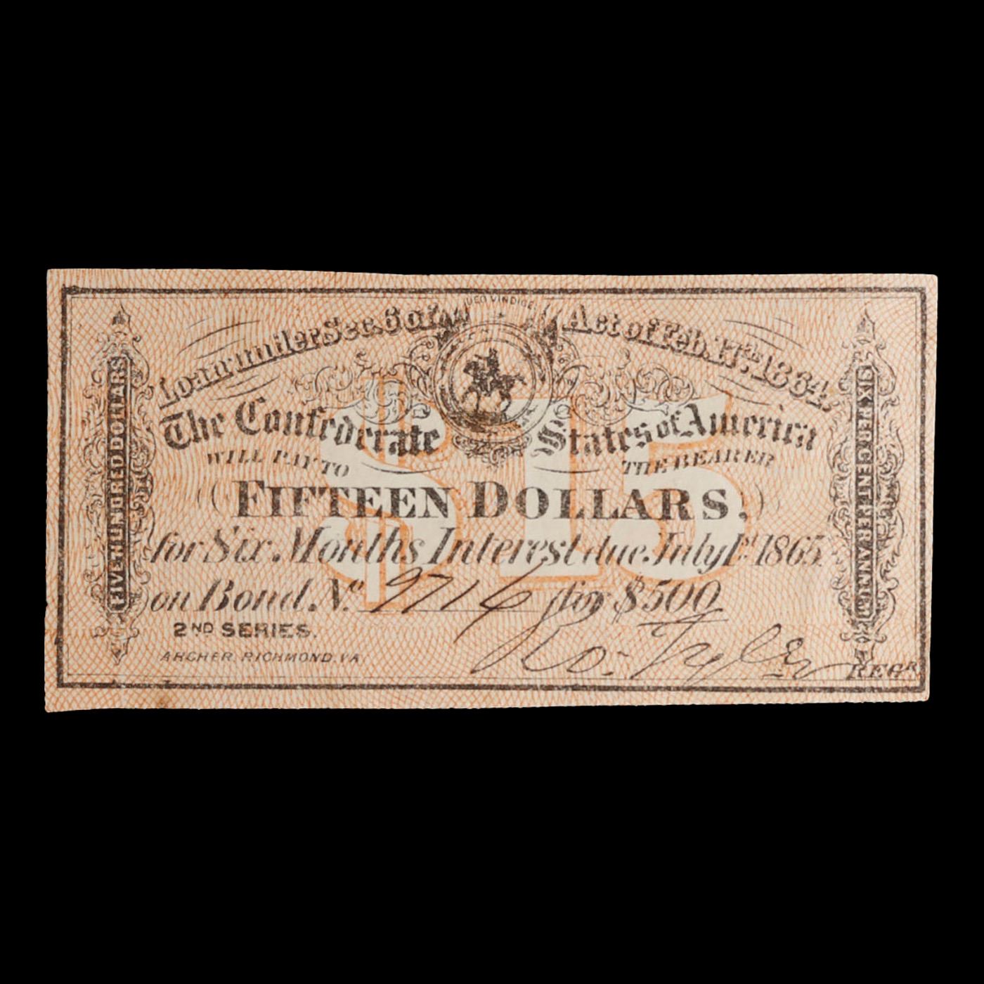 C.S.A Feb 17th, 1864. $15 Intrest Note Grades Choice AU/BU Slider