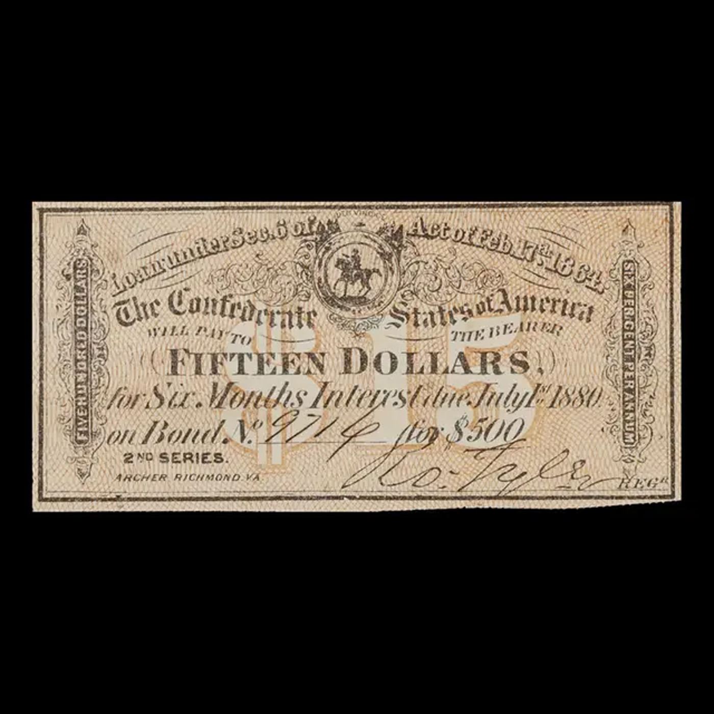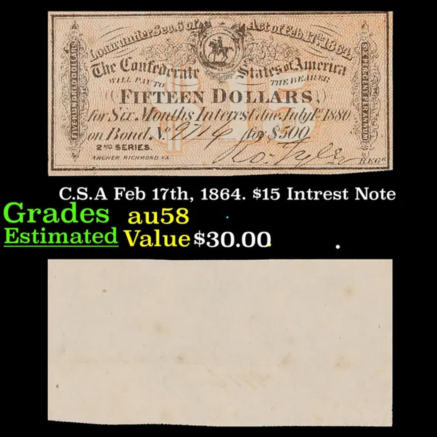 C.S.A Feb 17th, 1864. $15 Intrest Note Grades Choice AU/BU Slider