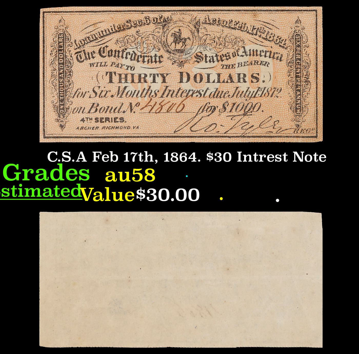 C.S.A Feb 17th, 1864. $30 Intrest Note Grades Choice AU/BU Slider.