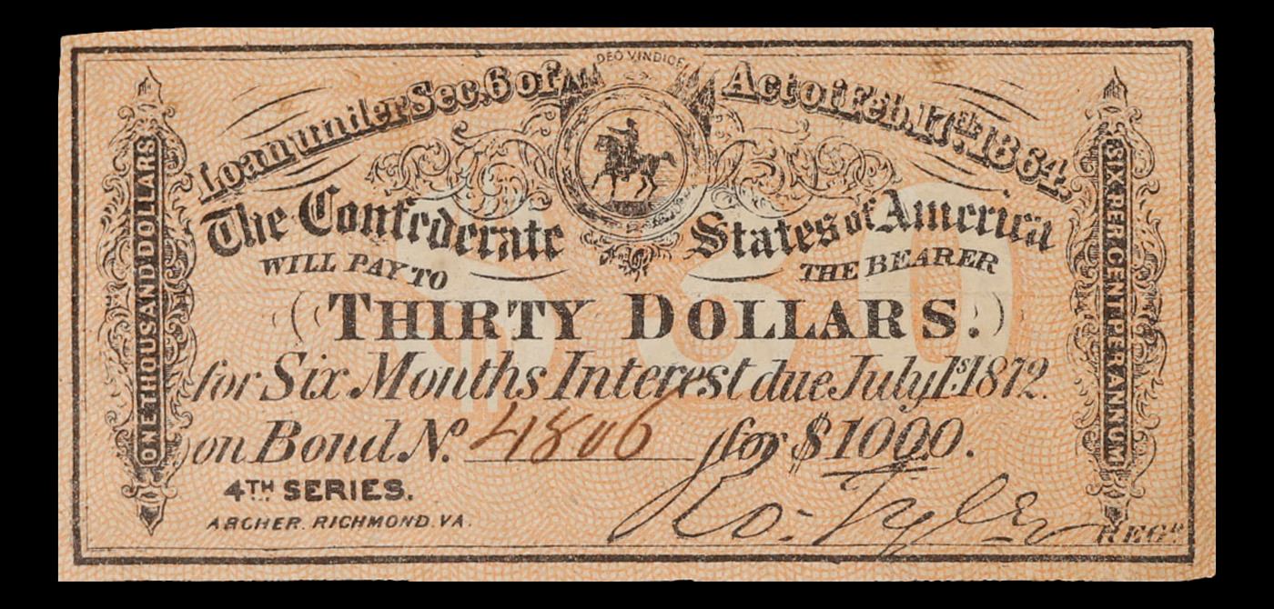 C.S.A Feb 17th, 1864. $30 Intrest Note Grades Choice AU/BU Slider