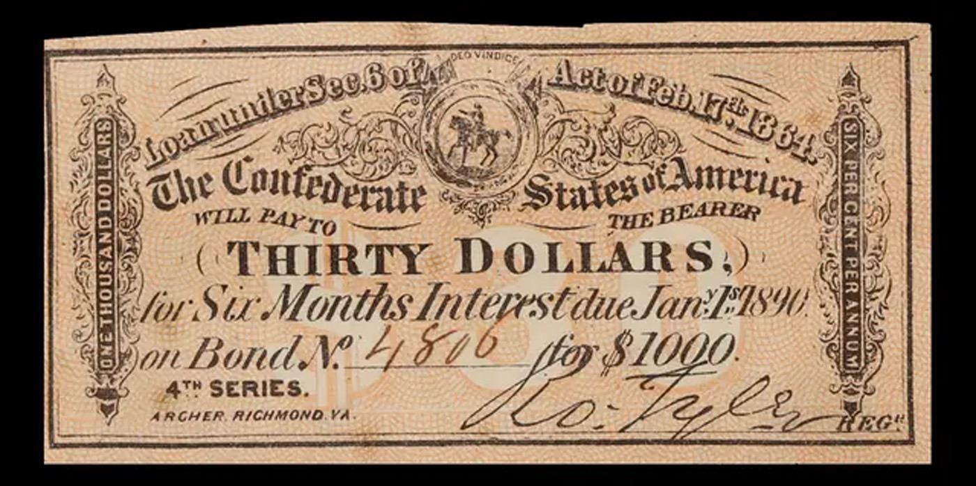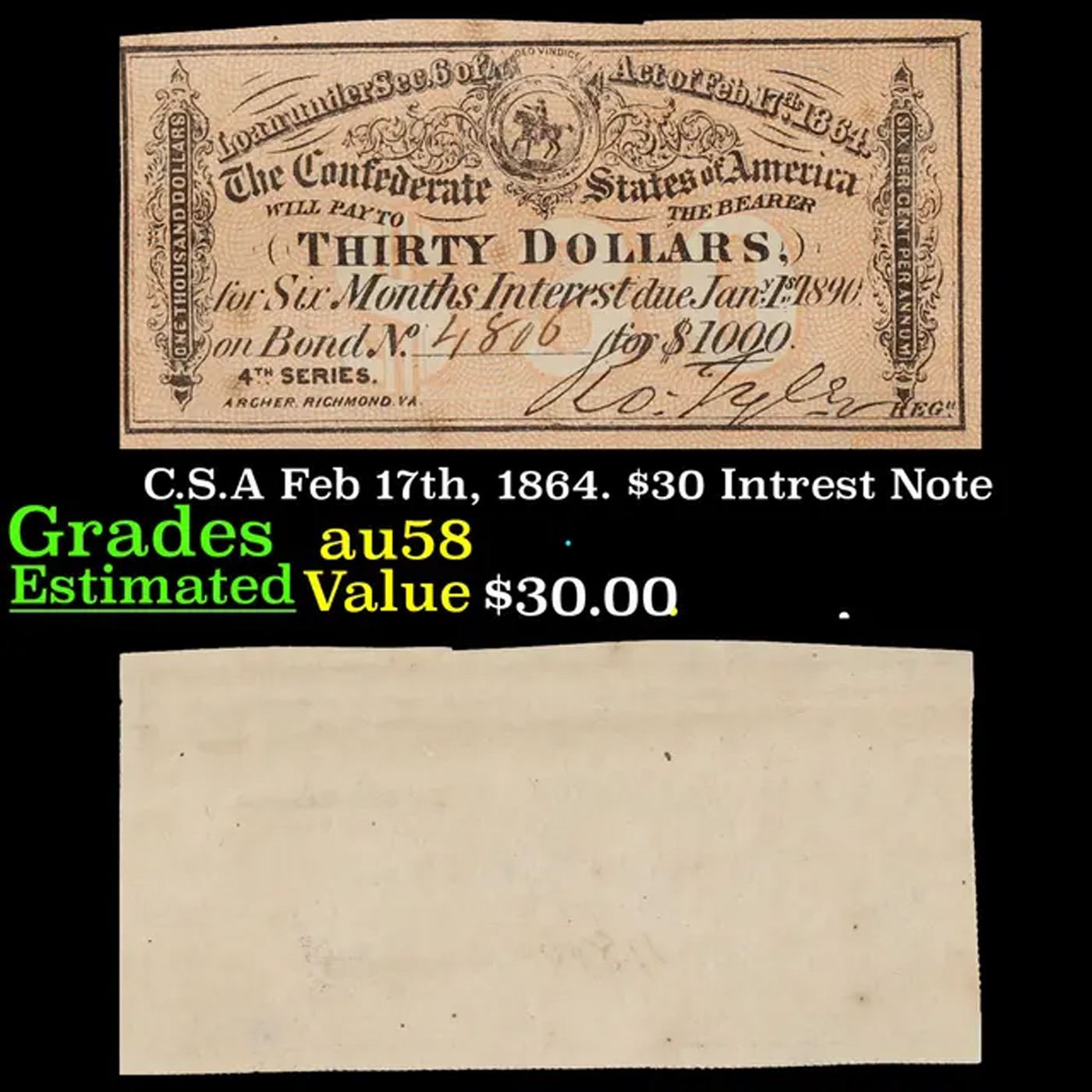 C.S.A Feb 17th, 1864. $30 Intrest Note Grades Choice AU/BU Slider