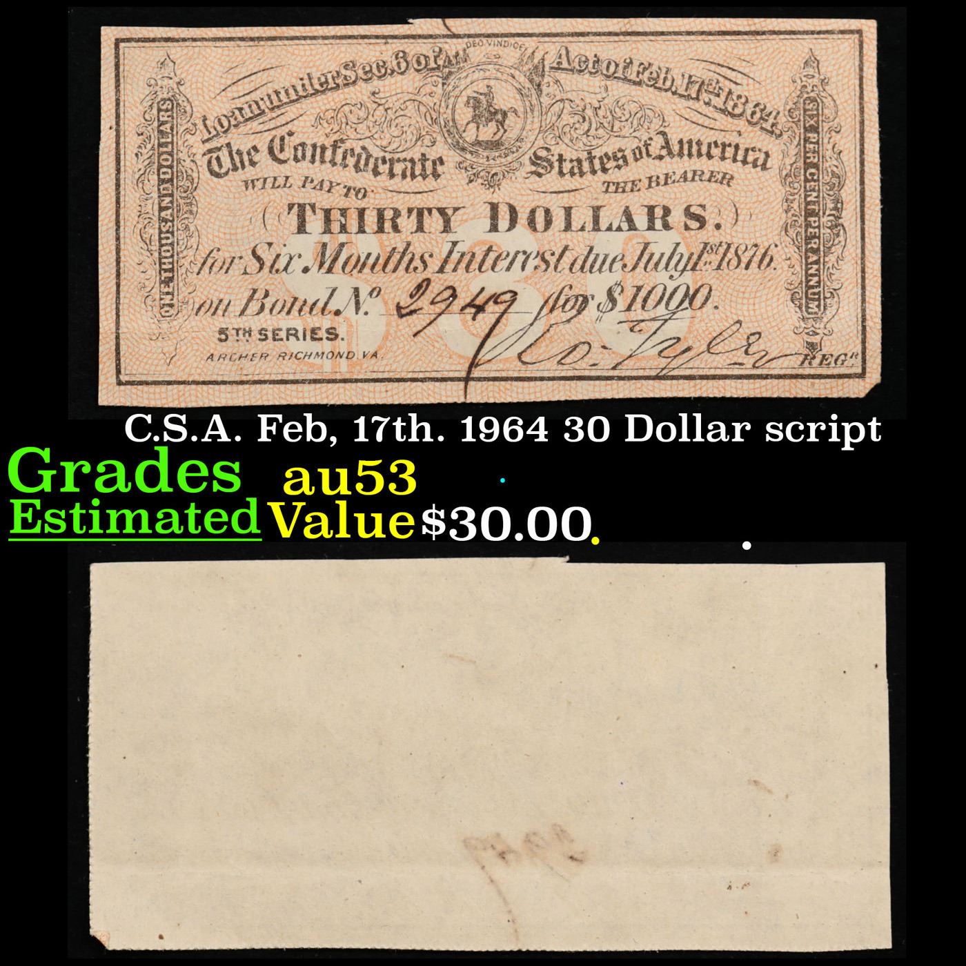 C.S.A. Feb, 17th. 1964 30 Dollar script Grades Select AU.